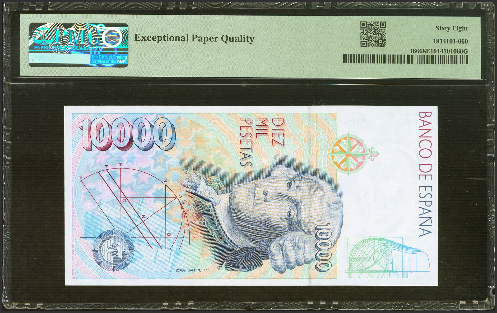 10000 Pesetas. 12 de Octubre de 1992. Sin serie. (Edifil 2021: 485, Pick: 166). Raro en esta excepcional calidad, apresto original. SC. Encapsulado PMG68EPQ.