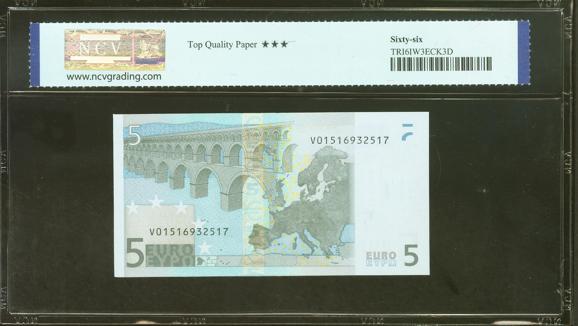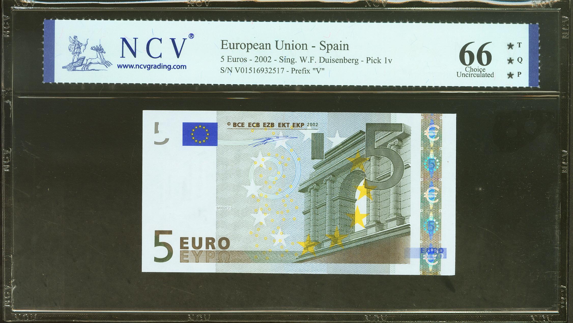 5 Euros. 1 de Enero de 2002. Firma Duisenberg. Serie V (España). (Edifil 2023: 486, Pick: 1v). SC. Encapsulado NCV66TQP.