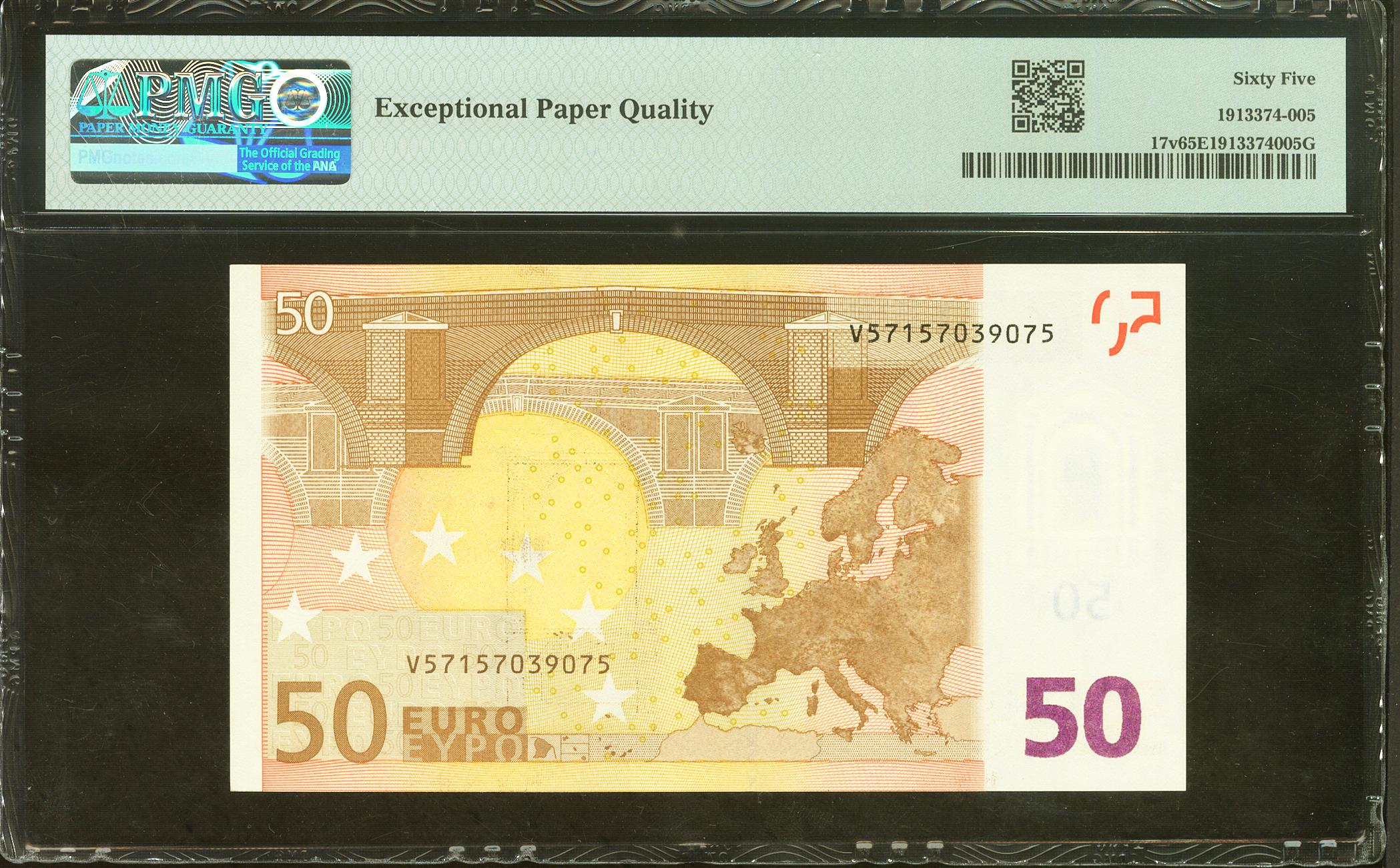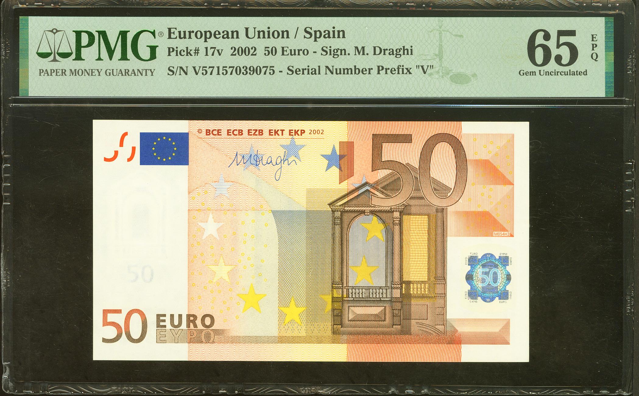 50 Euros. 1 de Enero de 2002. Firma Draghi. Serie V (España). (Edifil 2021: 489B, Pick: 17v). SC. Encapsulado PMG65EPQ.