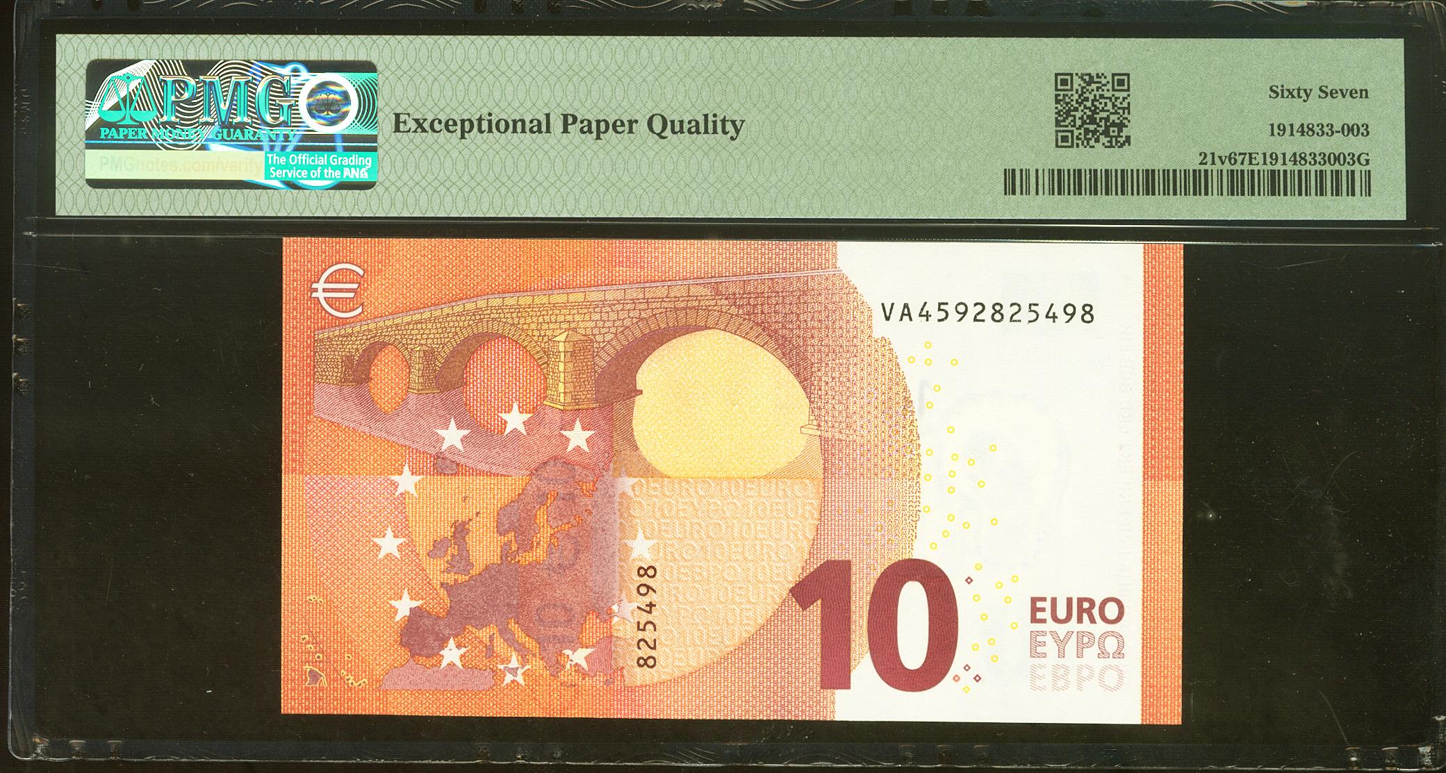 10 Euros. 23 de Septiembre de 2014. Firma Draghi. Serie V (España). (Edifil 2021: 494, Pick: 21v). SC. Encapsulado PMG67EPQ.
