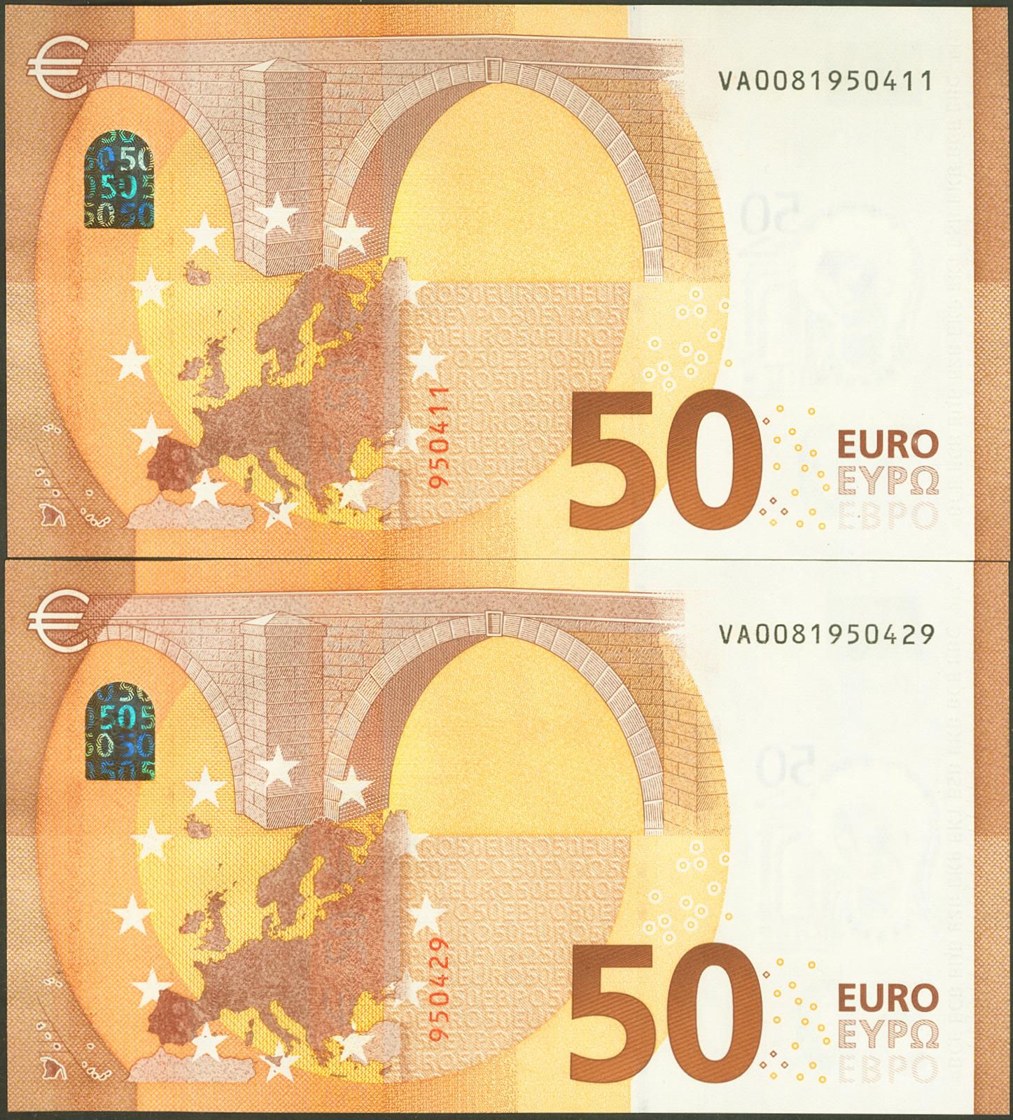 50 Euros. 4 de Abril de 2017. Pareja correlativa (cabe recordar que el último dígito de todos los billetes denominados en euros es para control interno del Banco Central Europeo, el que marca la correlatividad de los billetes es el penúltimo dígito). Firma Draghi. Serie V (España). (Edifil 2023: 496). SC.
