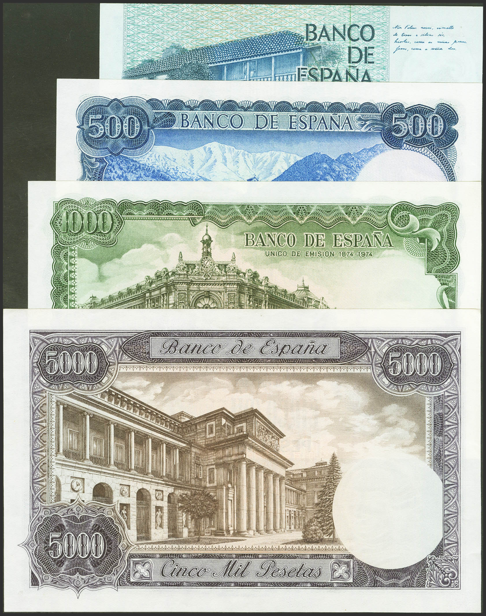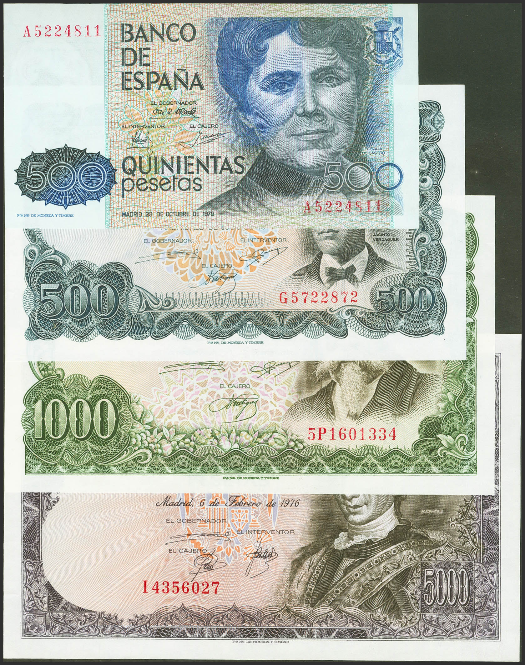 Conjunto de cuatro billetes de 500 Pesetas (2), 1000 Pesetas y 5000 Pesetas emitidos el 23 de Julio de 1971, 17 de Septiembre de 1971, 6 de febrero de 1976 y 23 de Octubre de 1979, con las series A, G, I y 5P, respectivamente (Edifil 2021: 473a, 474c, 475a, 476a). SC-.