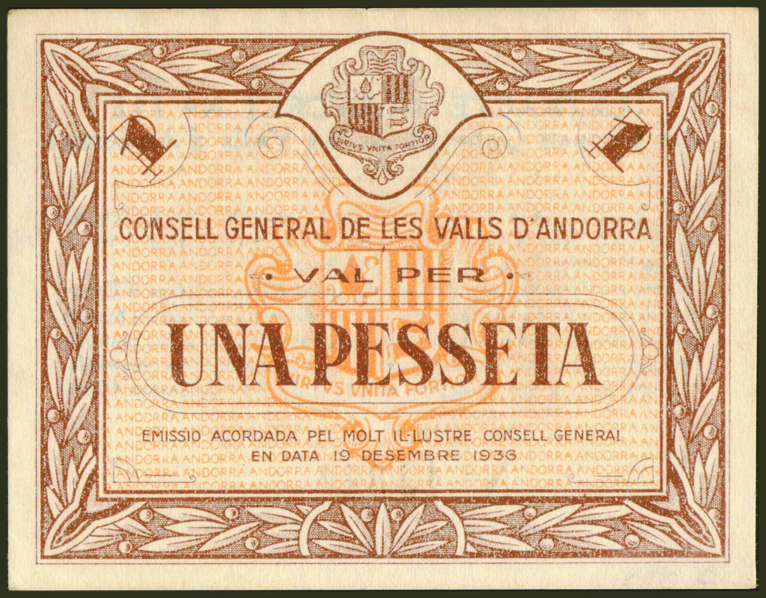 ANDORRA. 1 Pesseta. 19 de Diciembre de 1936. Sin serie. (Edifil 2021: 3). Conserva todo su apresto original. SC-.