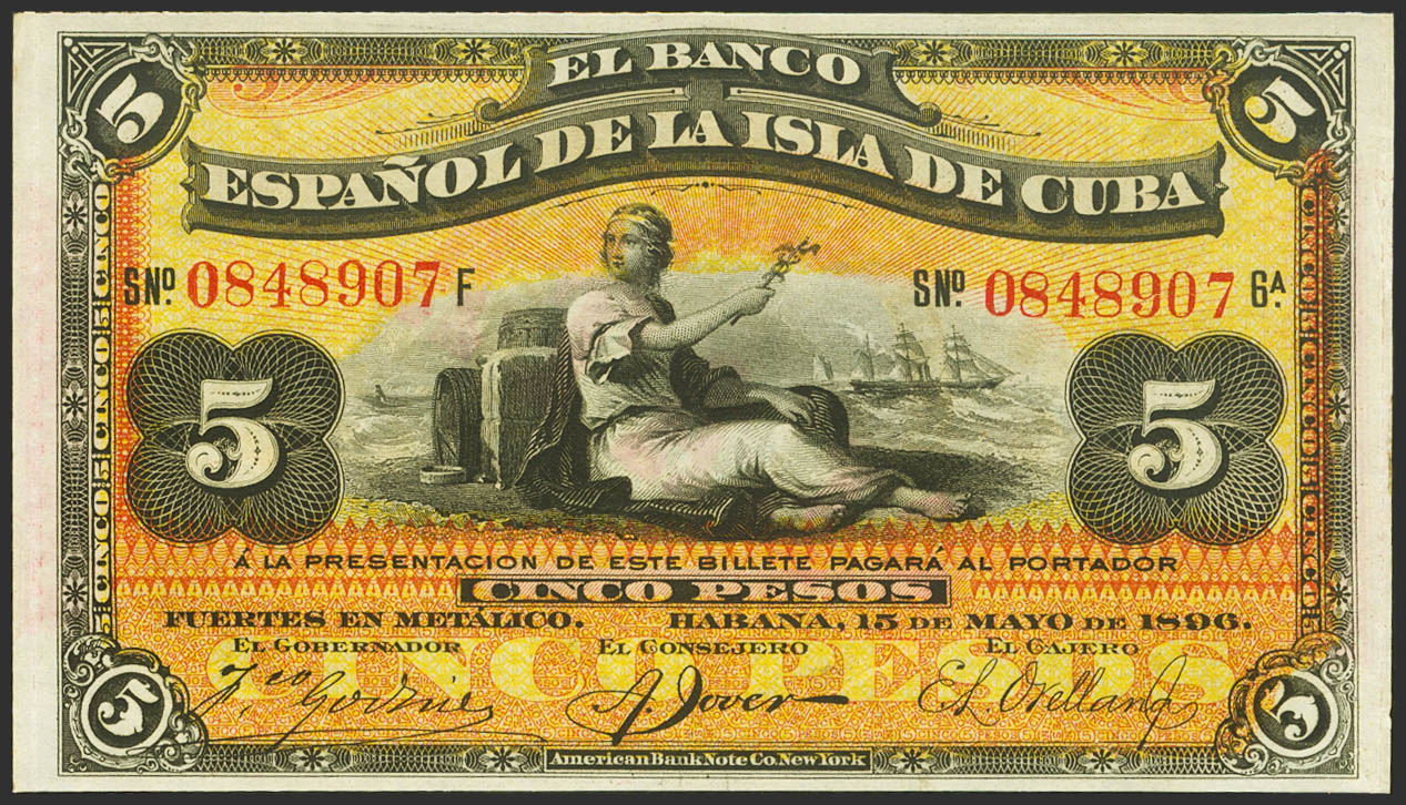 BANCO ESPAÑOL DE LA ISLA DE CUBA. 5 Pesos. 15 de Mayo de 1896. Sobrecarga PLATA, en el reverso. (Edifil 2023: 81). Raro, apresto original. SC-.
