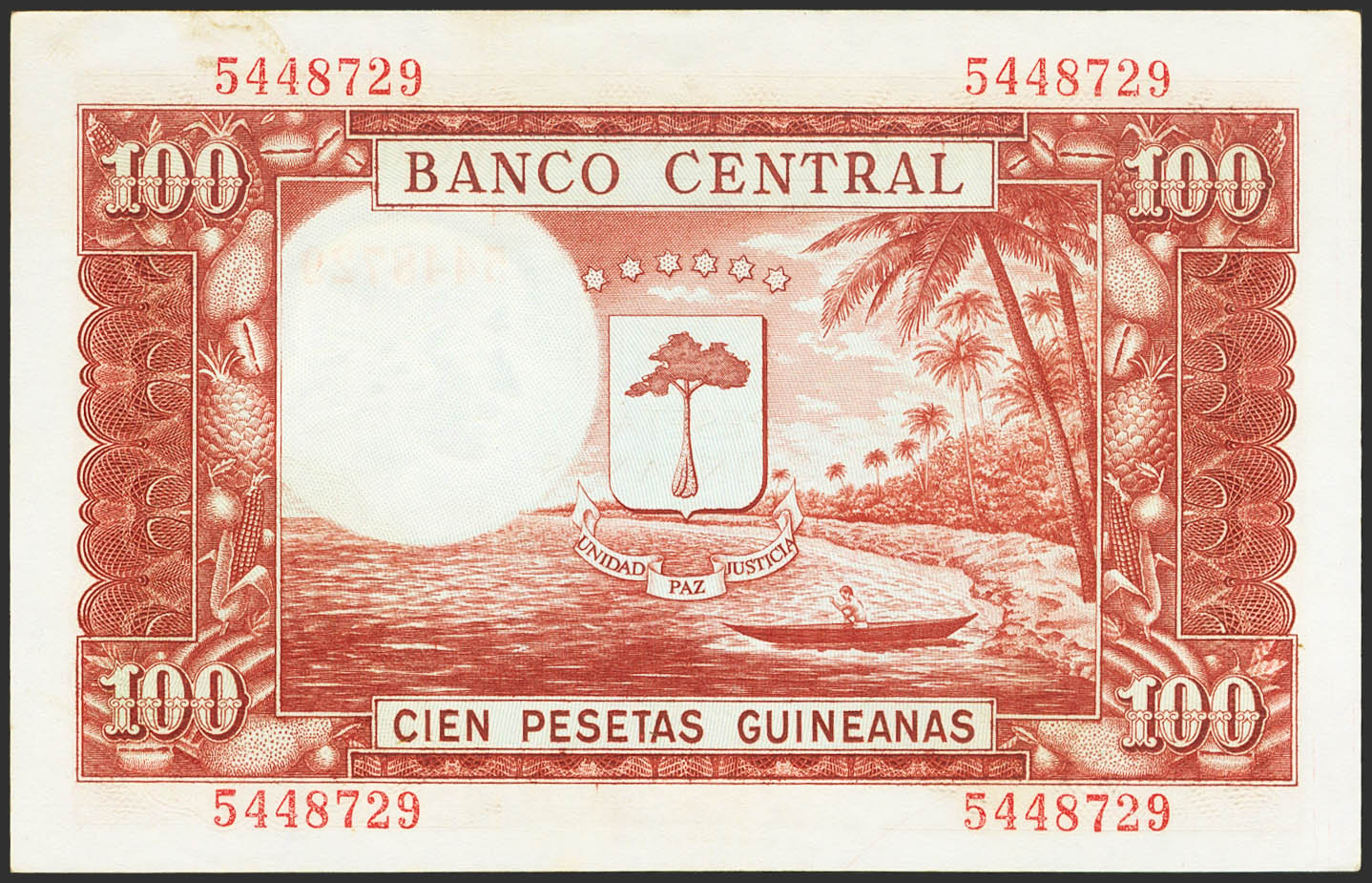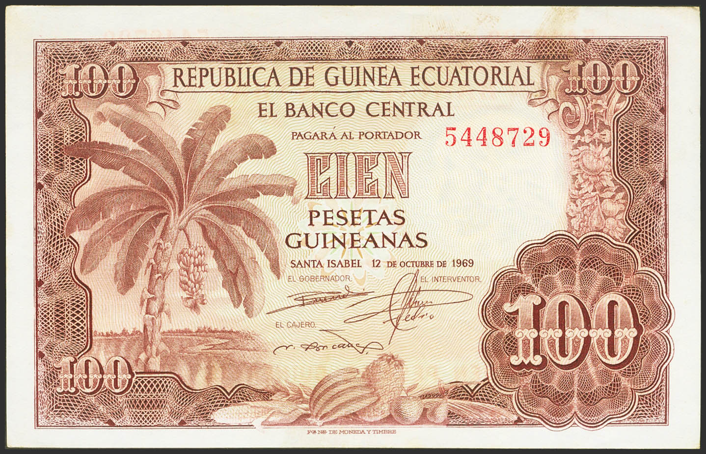 GUINEA ECUATORIAL. 100 Pesetas. 12 de Octubre de 1969. Sin serie. (Pick: 1). Conserva todo su apresto original. SC--.