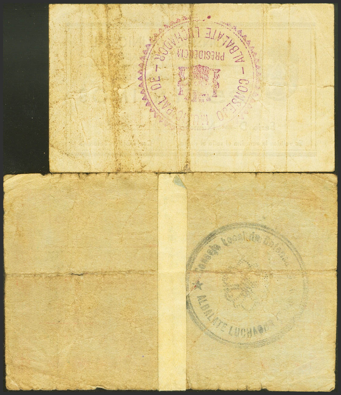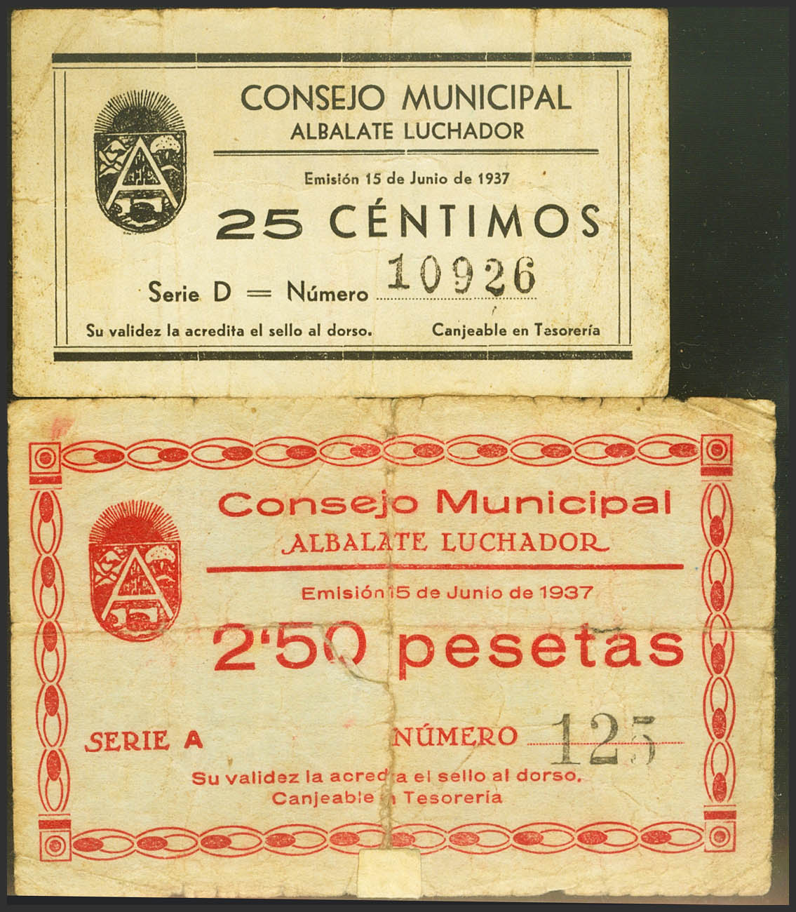 ALBALATE LUCHADOR (TERUEL). 25 Céntimos y 2´50 Pesetas. 15 de Junio de 1937. Series D y A, respectivamente. (González: 173, 176). Raros, el 2´50 pts reforzado con cinta adhesiva. MBC+/RC.