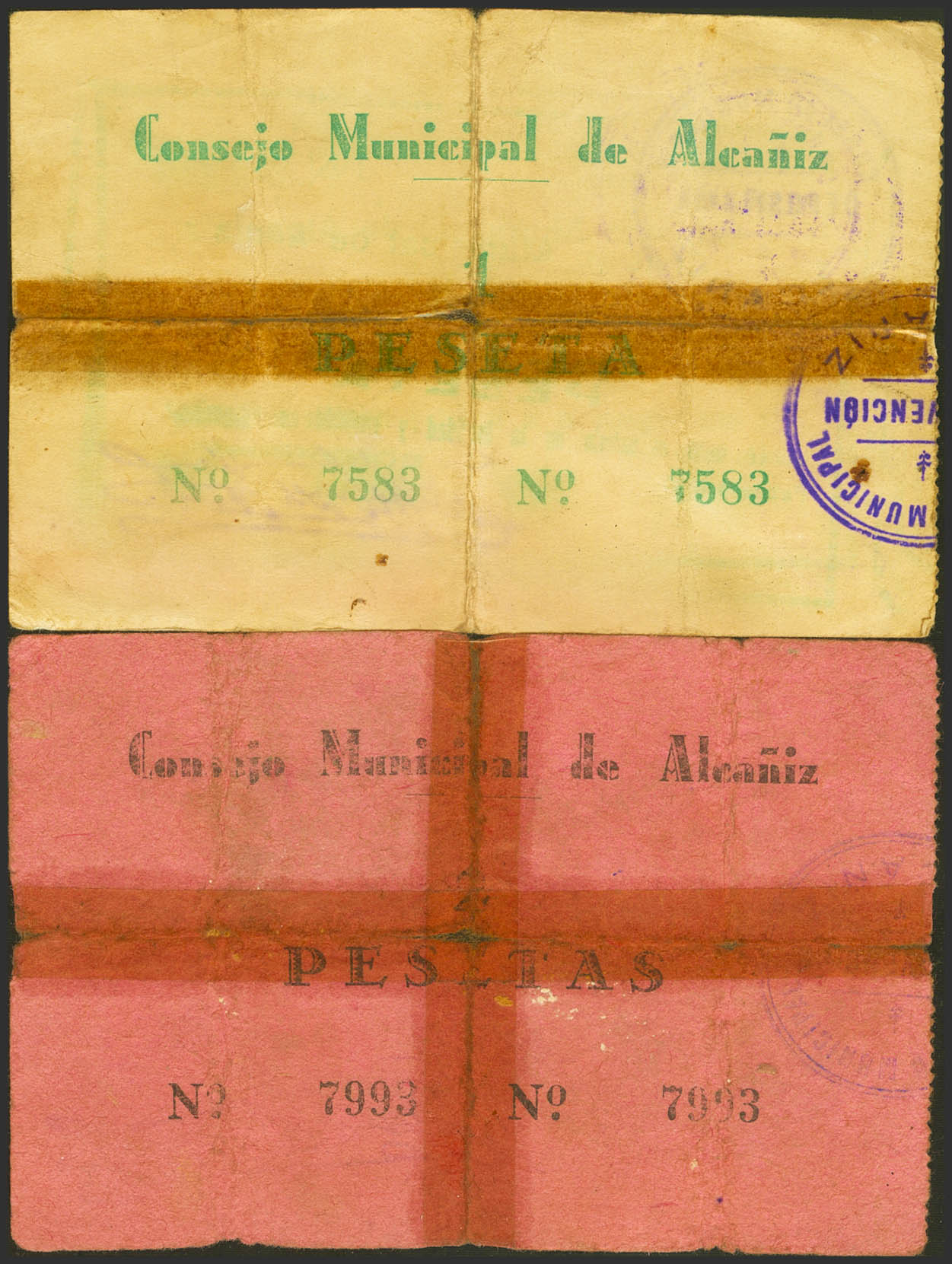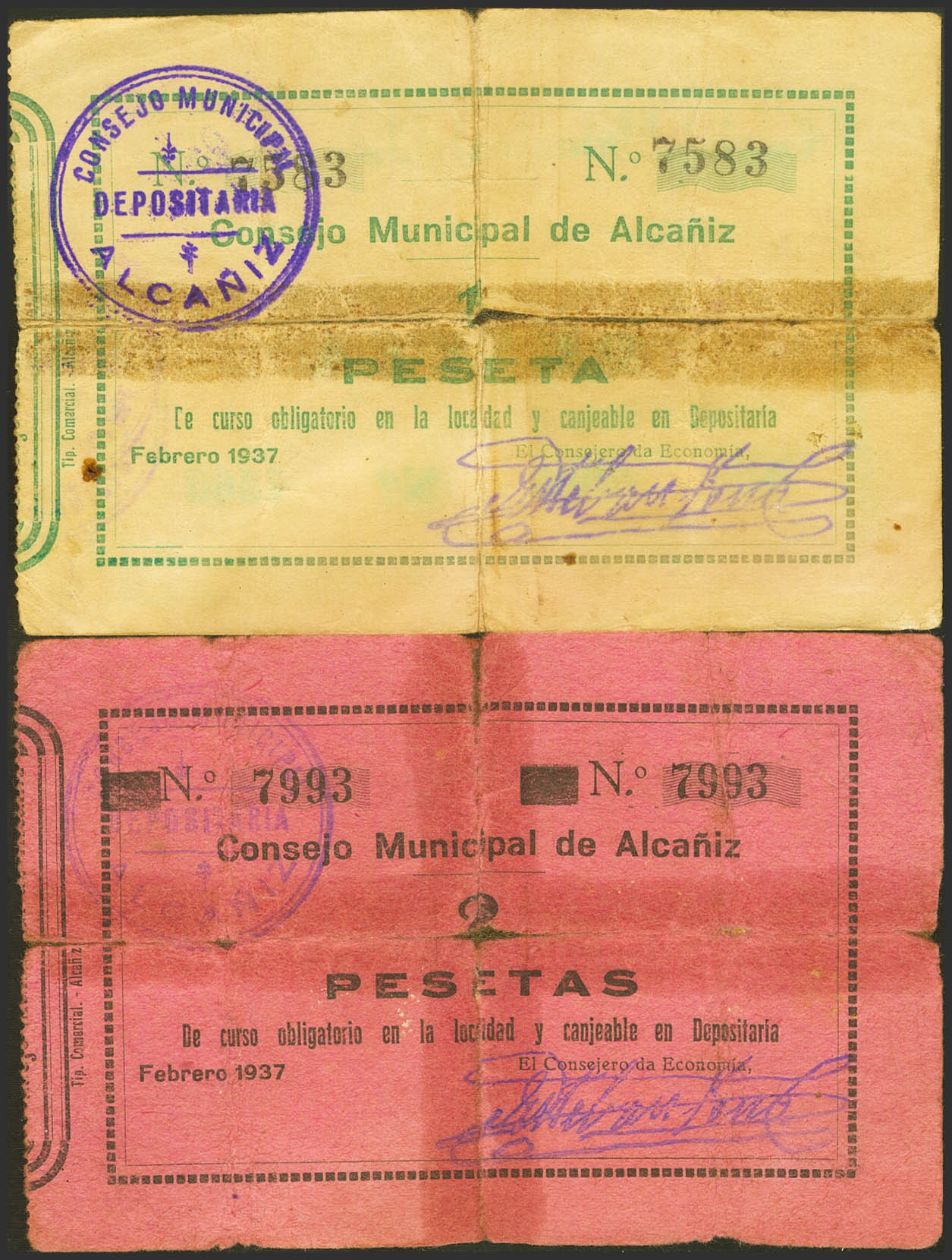ALCAÑIZ (TERUEL). 1 Peseta y 2 Pesetas. Febrero 1937. (González: 295/96). Inusual serie completa reforzada con cinta adhesiva. RC+.
