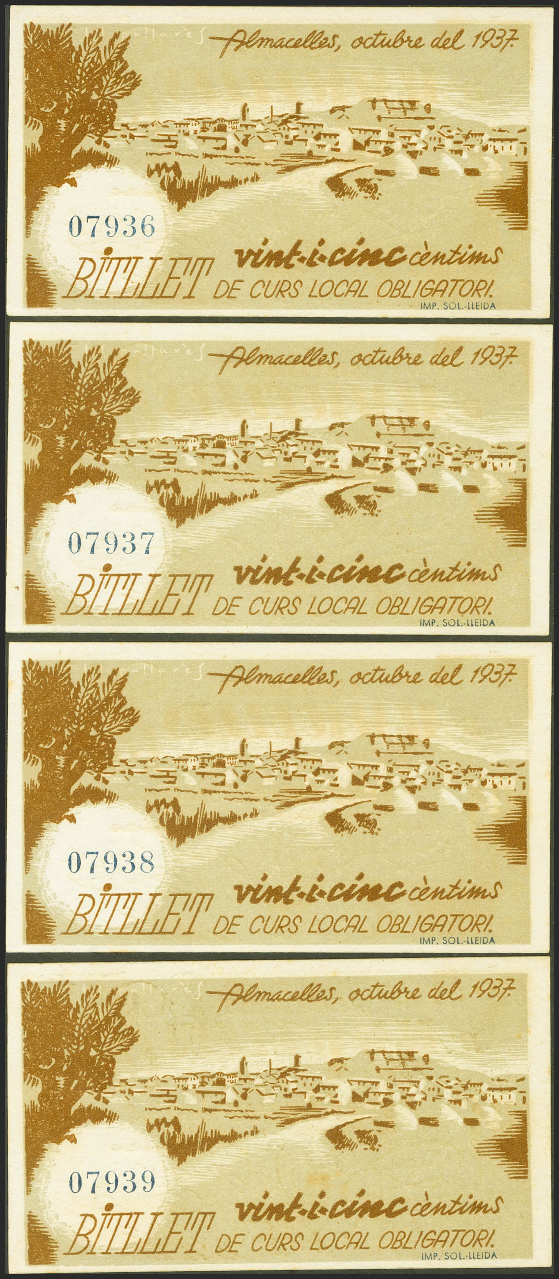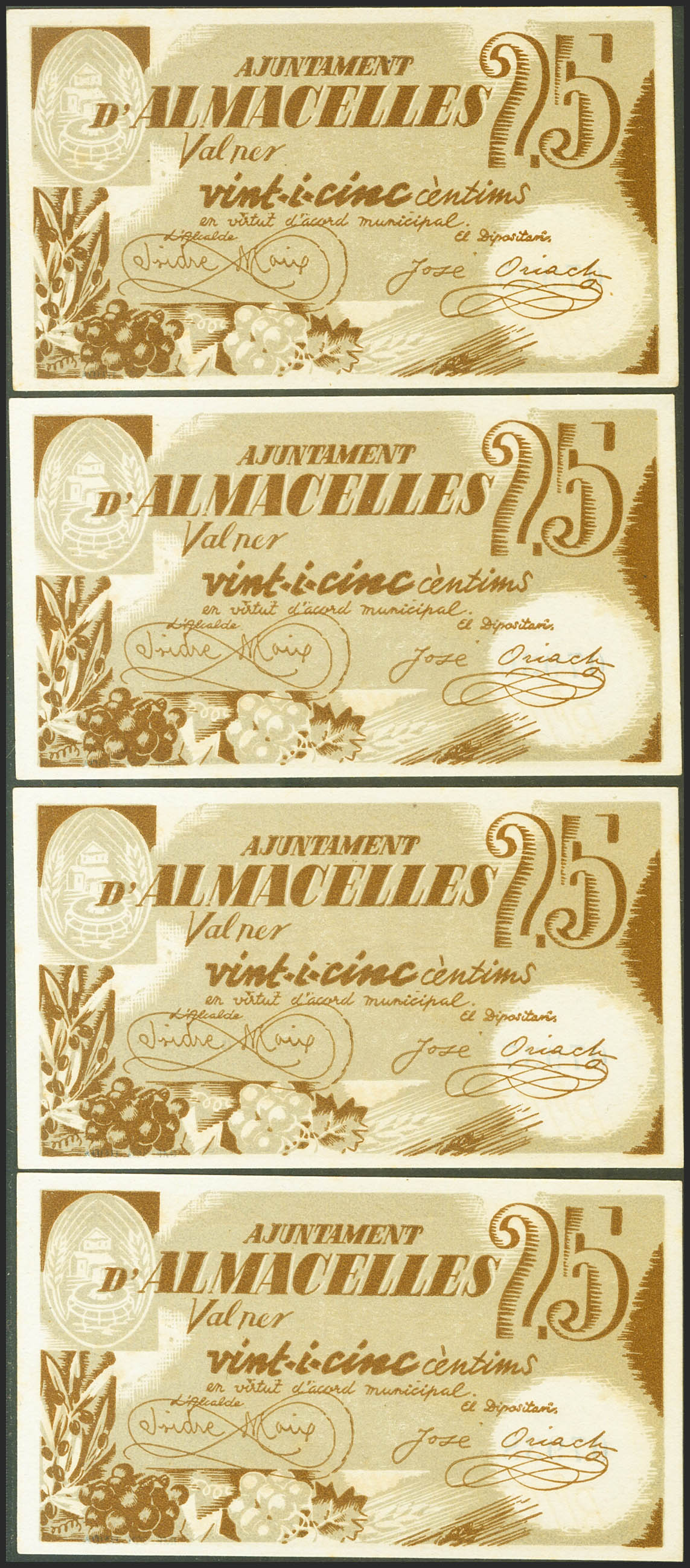 ALMACELLES (LERIDA). 25 Céntimos. Octubre 1937. 4 billetes correlativos. (González: 6207). SC-.