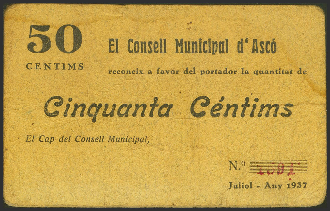 ASCO (TARRAGONA). 50 Céntimos. Julio 1937. (González: 6437). Muy raro. MBC+.
