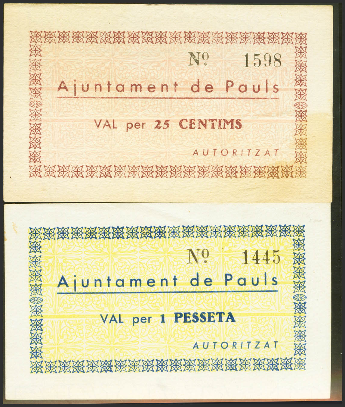PAULS (TARRAGONA). 25 Céntimos y 1 Peseta. (1937ca). (González: 9177, 9179). Raros. EBC-.