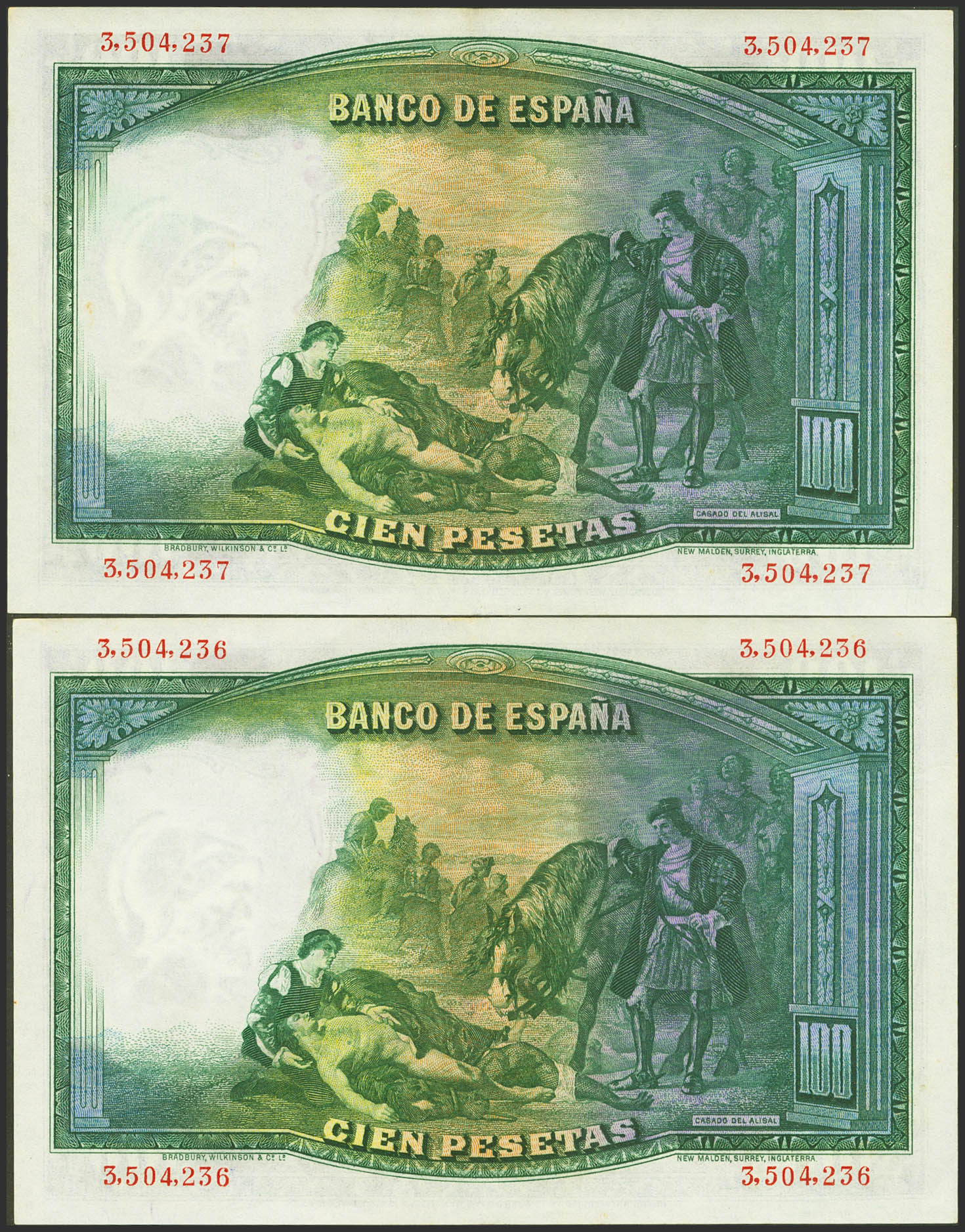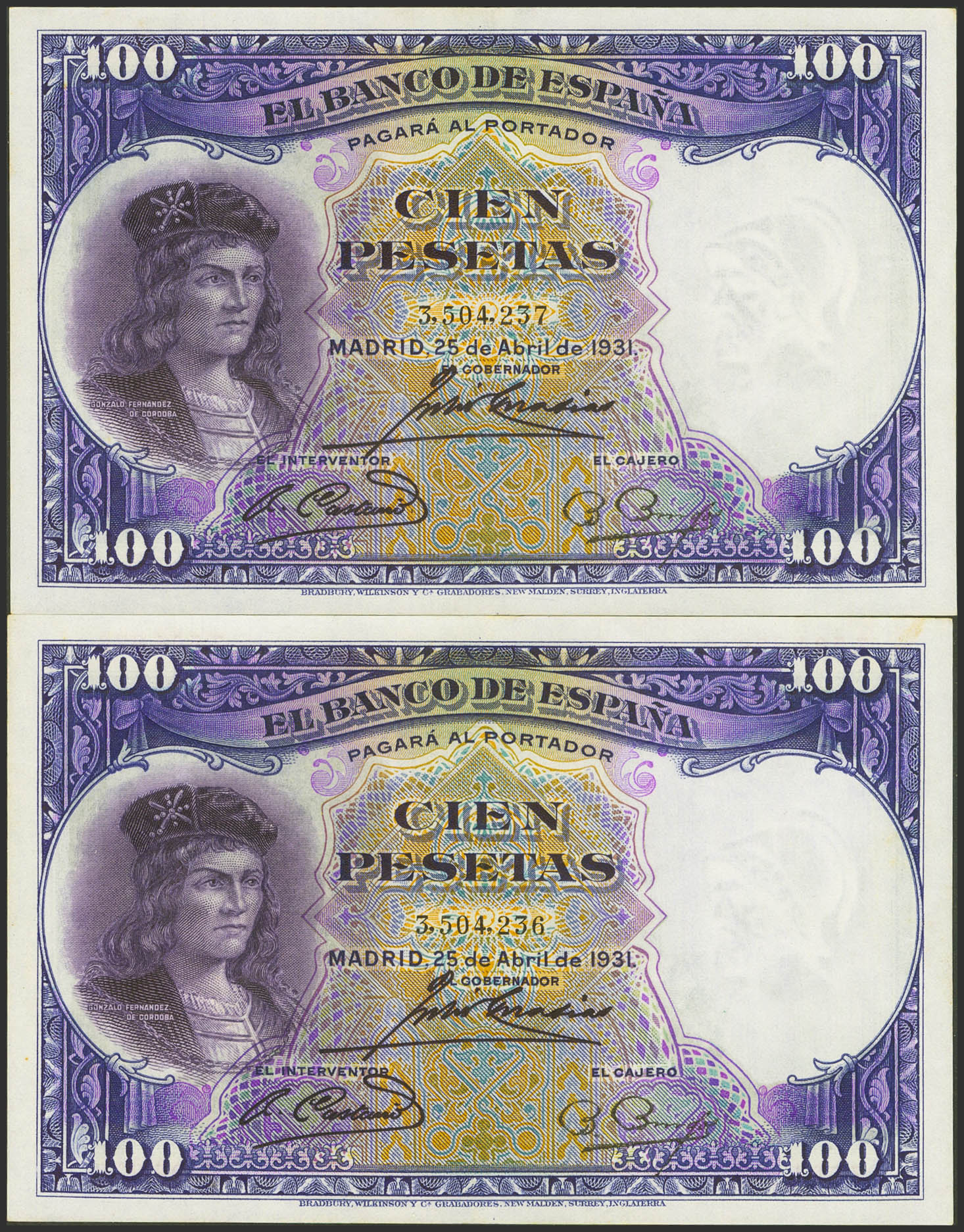 100 Pesetas. 25 de Abril de 1931. Pareja correlativa. Sin serie. (Edifil 2017: 360). Apresto original. EBC+.