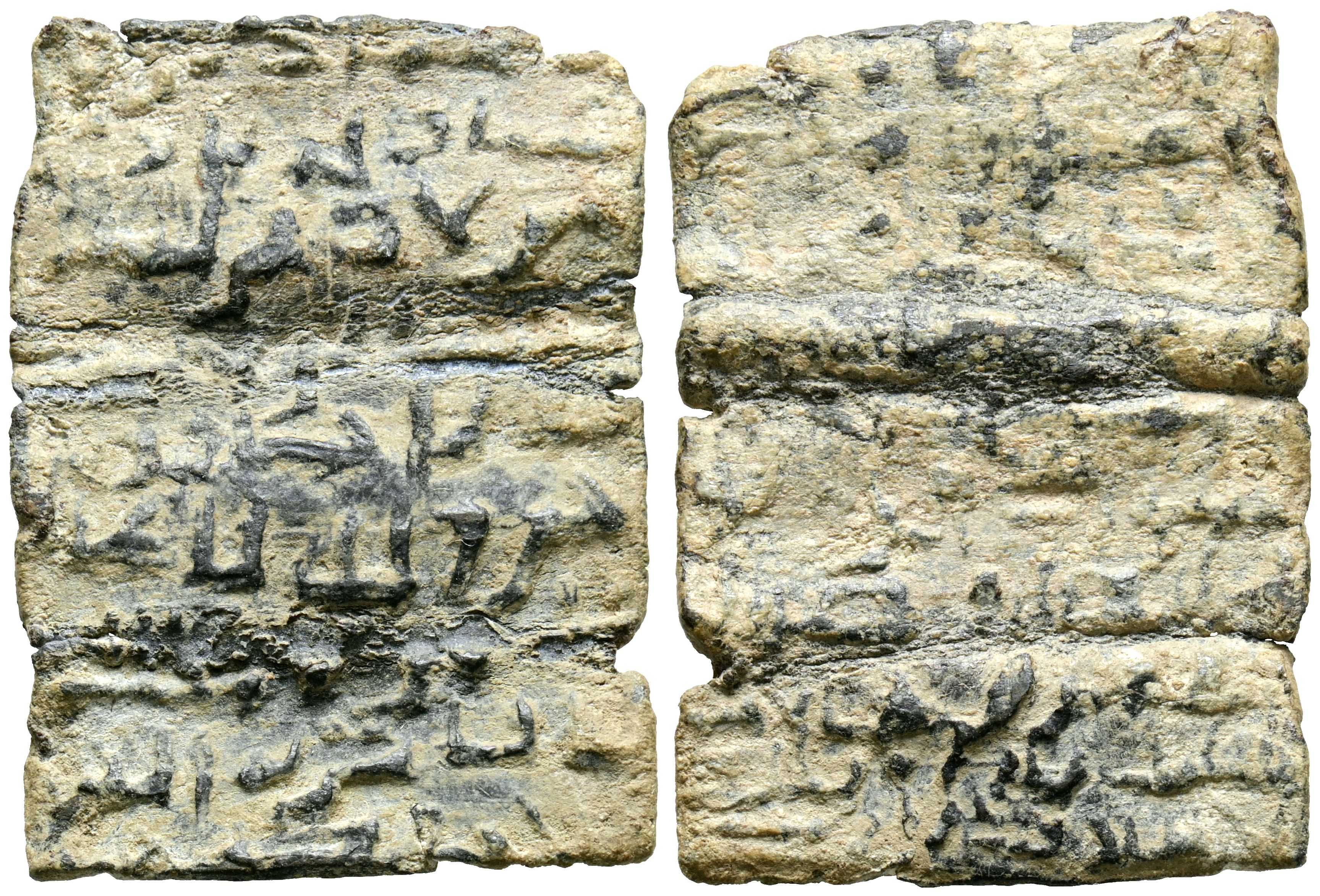 PERIODO DE TAIFAS O POSTERIOR. Amuleto rectangular. (Pb. 7,93g/32x23mm). Posiblemente Siglo XI-XIII. Placa rectangular de plomo con signos de haber estado plegado en forma de tríptico cerrado. En ambas áreas, leyendas divididas en nueve líneas de escritura cúfica de trazos descuidados, o primitivos, de difícil lectura. (Amuletos 39-G7. Tipo A-I, mismo ejemplar). MBC.