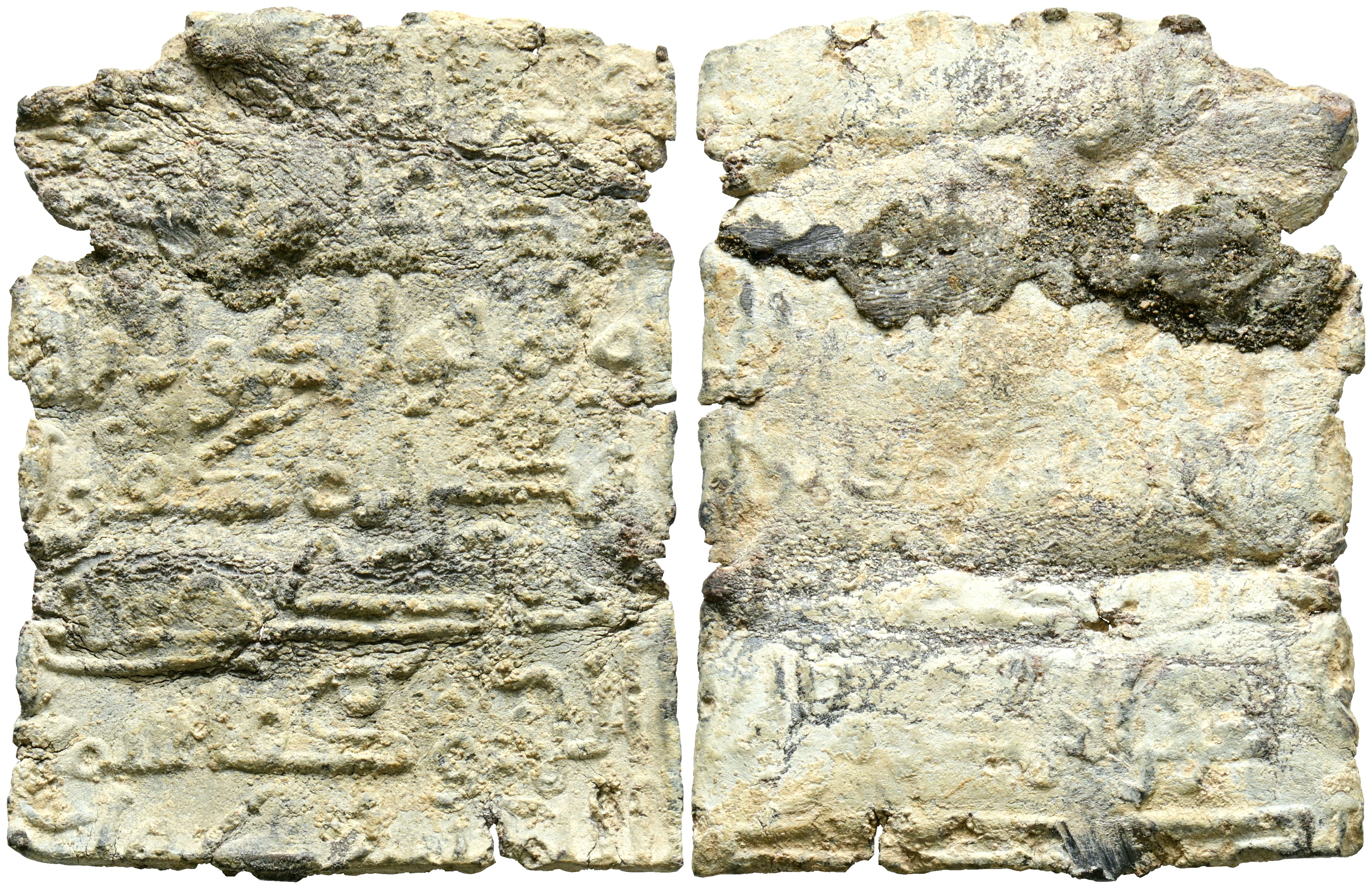 PERIODO ALMORÁVIDE O POSTERIOR. Amuleto rectangular. (Pb. 12,26g/42x32mm). Posiblemente Siglo XII-XIV. Placa rectangular de plomo con signos de haber estado plegado en forma de tríptico y textos coránicos en cúfico elegante, con algunas letras floreadas. Anv: Dividido en seis líneas de las cuales solo es legible al completo la primera: بسم الله الرحمن الر / حيم ـ ـ ـ ـ. (¡En el nombre de Dios, el Clemente, el Misericordioso!.....) Rev: Divido en siete líneas: قل هو ألله أحد ألله / الصمد لم يلد / و لم يولد و لم / يكن له كفوا/ حسبي ـ أحد/ ألله و هو السميح / العلي ـ ـ. (Dí: Él es el Dios Único, el Dios Eterno, no engendró y no fue engendrado, y no tiene semejante ninguno. Me basta Dios, Él es el Benévolo, el Ilustre ...). La parte superior parece estar reparada-pegada. (Amuletos 44-G5. Tipo A-II, mismo ejemplar). MBC.