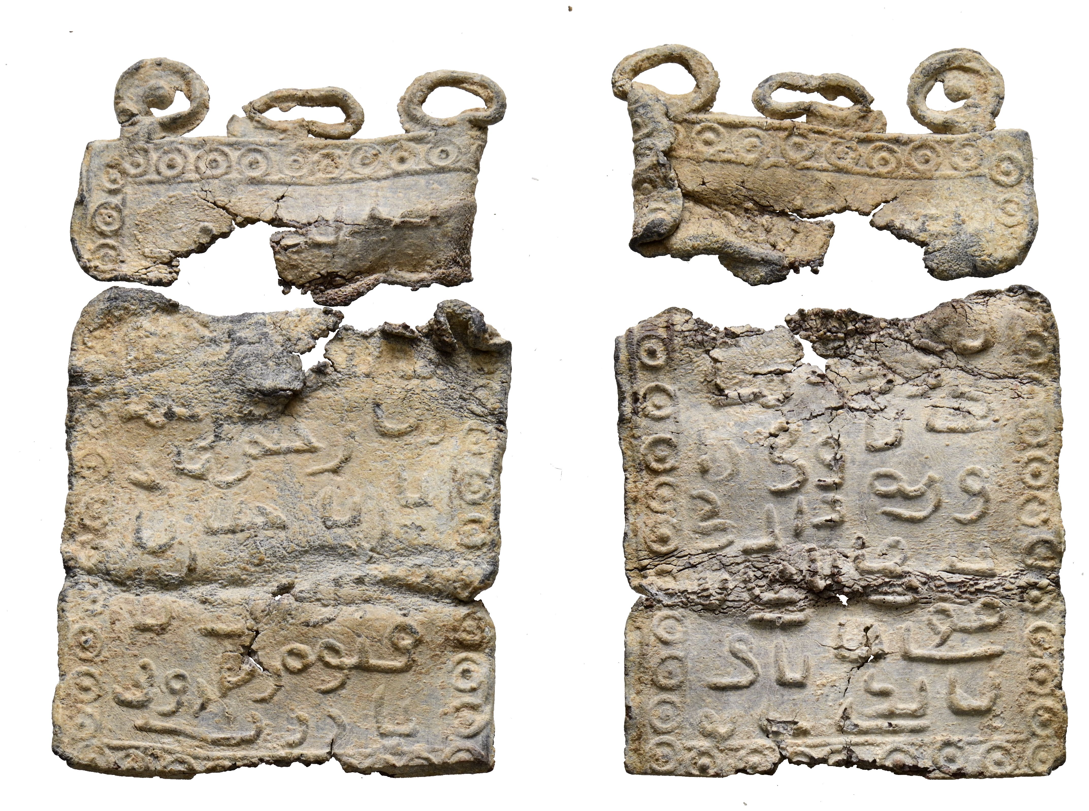 PERIODO AMORÁVIDE O ALMOHADE. Amuleto rectangular. (Pb. 5,78g/39x24mm). Posiblemente Siglo XII-XIII. Placa rectangular de plomo dividida en dos parte con señales de haber estado plegada en forma de tríptico. La parte superior conserva tres anillos de suspensión. Bordea toda la pieza, en anverso y reverso, una banda recorrida por una línea de círculos con punto central. Las leyendas se dividen en siete líneas en cada área, en lo que parece una letanía con los nombres de Dios. Anv: ضار ـ ـ / يا إله يا رحما / ن يا رحيم يا مـ /نان يا جبار يا / مدير يا ـ ـ ـ ـ يا /قيوم يا رؤف / يا ا رب. Rev: بسم ألله / ـ ـ ـ ـ /ـ ـ ـ ـ ـ /ـ ـ ـ ـ ـ /يا رضا يا علي يا / مول ى يا باقي /يا بادئ يا نور . La escritura está realizada en cúfico simple, de trazos suaves y tendencia a la curva, aunque toscos y descuidados, sin mantener las líneas base de escritura. (Amuletos 424-TN25. Tipo A-IV, mismo ejemplar). MBC-.