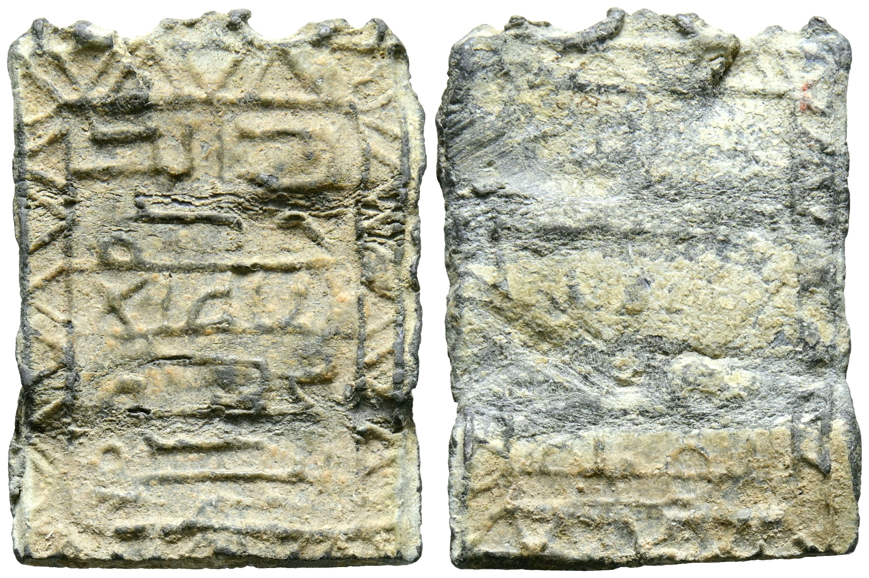 PERIODO CALIFAL O POSTERIOR. Amuleto rectangular. (Pb. 4,13g/26x19mm). Posiblemente Siglo X-XI. Placa rectangular de plomo con señales de haber estado plegada en forma de tríptico y restos de dos aros de sujeción en la parte superior. En ambas áreas, cinco líneas de escritura en cúfico lineal bien ejecutado. Recorre todo el borde de ambas áreas, una banda en la que se repite un motivo de rayitas dobles diagonales que dibujan triángulos. En anverso y reverso, otras cinco líneas de escritura, pero mucho más deteriorada. (Amuletos Tipo A-I/IV). MBC+.