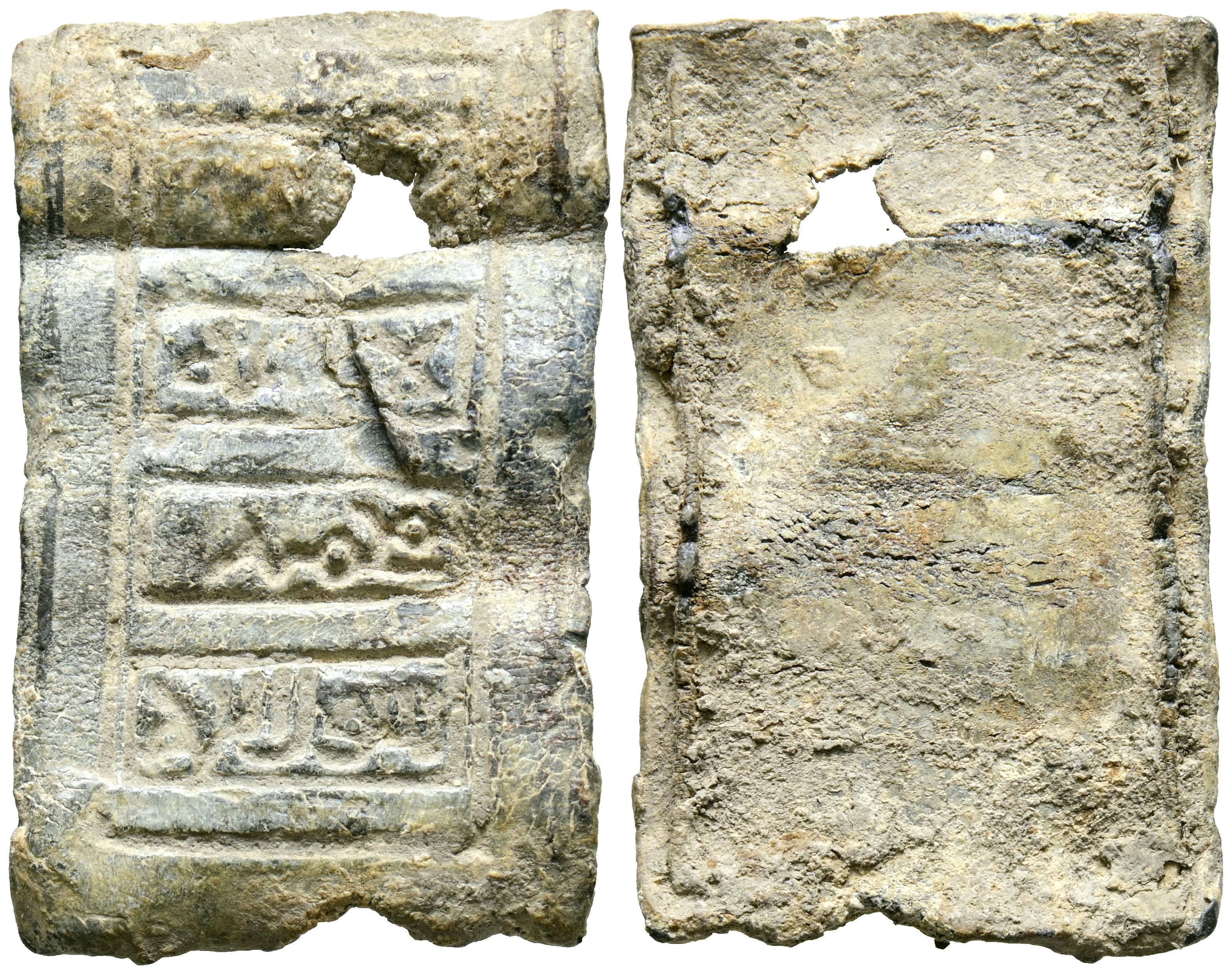 PERIODO CALIFAL. Amuleto rectangular. (Pb. 7,57g/35x21mm). Posiblemente Siglo X. Abrazadera rectangular de una correa. Anv: Inscrito un rectángulo menor en sentido longitudinal en el que se insertan cuatro cartelas epigráficas separadas entre sí y de los lados menores del rectángulo por cinco bandas lisas. Los lados largos de la pieza recrecen hacia el dorso para formar la caja en la que se insertaba la correa, fijada mediante un remache del que queda el orificio en la primera de las bandas epigráficas, que ha perdido su escritura casi por completo. La inscripción, a pesar de haber perdido el contenido de la primera cartela, debía decir: لا اله ا / لا لله / محمد / رسول الله. (no hay otro dios / que Dios / Muhammad / es el Enviado de Dios). Rev: Anepígrafo. (Amuletos Tipo A-IV; Pieza publicada en Manquso Nº14, pág. 169, por Tawfiq Ibrahim y Sebastián Gaspariño). MBC.