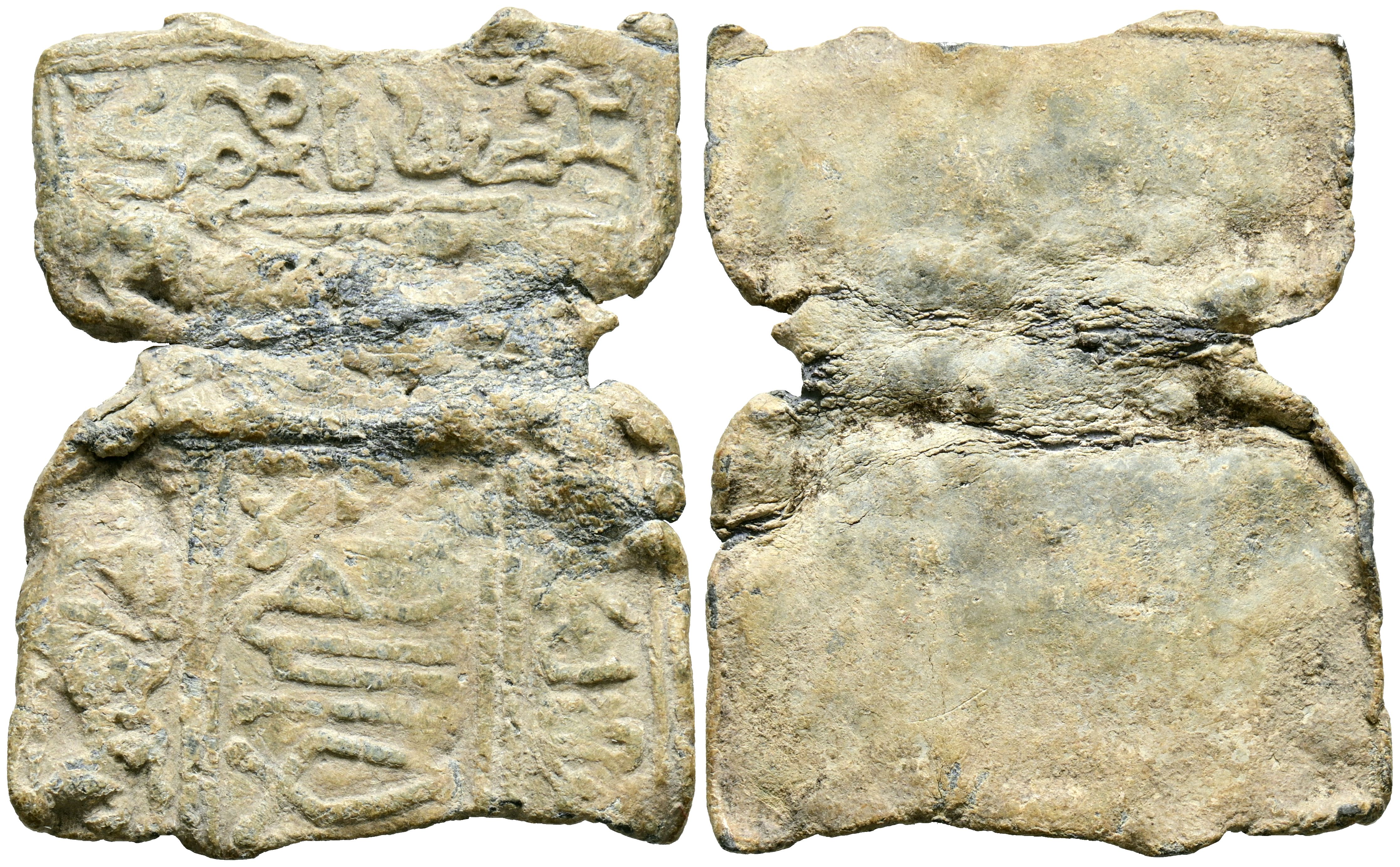 PERIODO ALMORÁVIDE O ALMOHADE. Amuleto rectangular. (Pb. 9,43g/38x31mm). Posiblemente Siglo XII-XIII. Placa rectangular de plomo con señales de haber estado plegada en forma de tríptico cerrado. (El tercio inferior se ha perdido). Anv: Anepígrafo. Rev: Texto coránico en cúfico evolucionado, con algunas letras terminadas en cuello de cisne, que se desarrolla en toda la banda de enmarcado y en una amplia línea que ocupa todo el campo central: لّا ألله....(...no Dios). Margen: تحصّنا يا محمّد / ـ ـ ـ ـ ܀ ـ ـ ـي الذي لا ـ ـ ـ. (Nos fortificamos, ¡oh Muhammad!/.... que no ......). (Amuletos 86-G8. Tipo A-V, mismo ejemplar). MBC+.