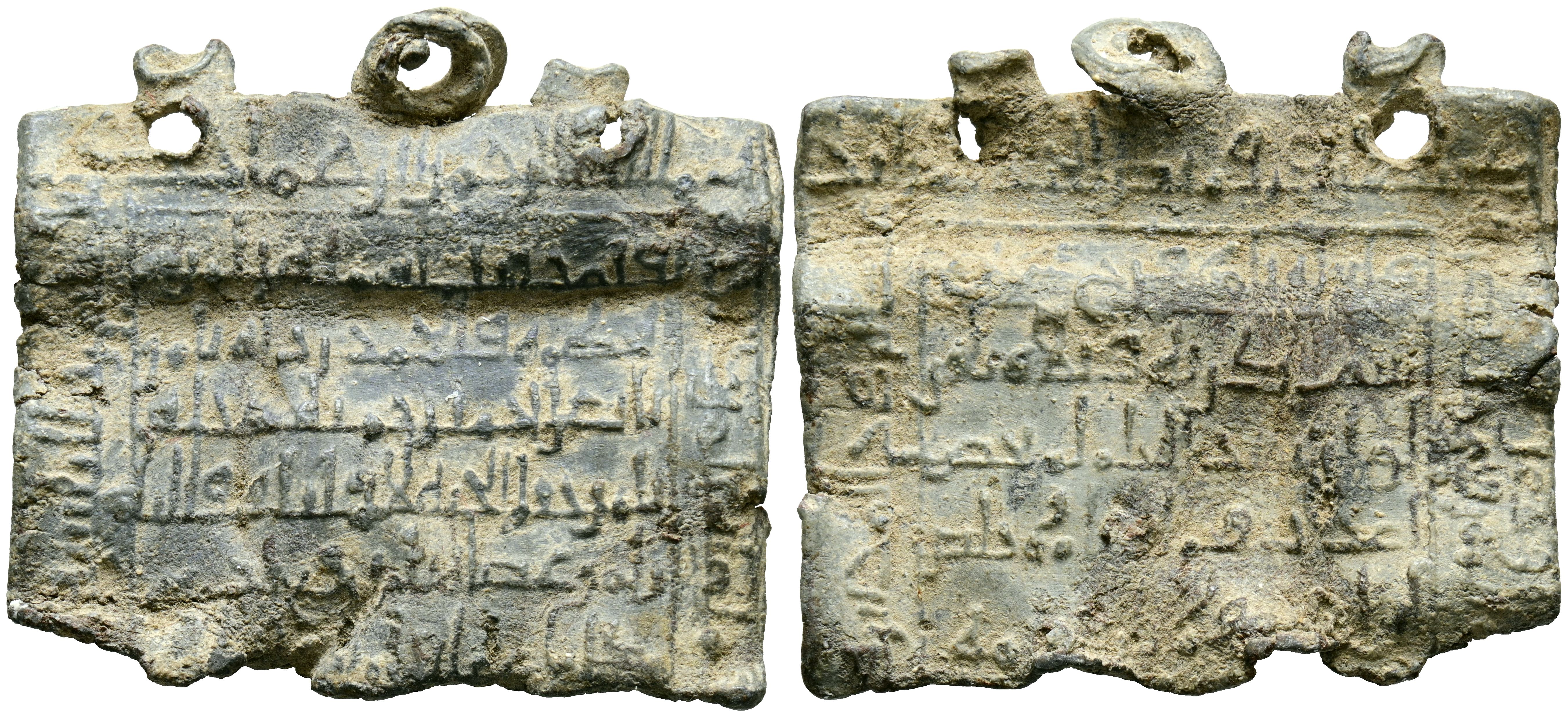 PERIODO CALIFAL. Amuleto rectangular. (Pb. 10,97g/38x34mm). Posiblemente Siglo X. Placa rectangular de plomo con señales de haber estado plegada y a la que parece faltar el sector inferior. En ambas áreas, texto coránico en cúfico lineal bien ejecutado, que se desarrolla en una banda epigráfica que bordea la pieza y un campo central del que quedan cinco líneas en anverso y seis en reverso. La pieza conserva en la parte superior una anilla de cuelgue o suspensión, y a sus lados, restos de otras dos más pequeñas. Así como dos pequeñas perforaciones justo debajo de las mismas. (Amuletos 364-N4. Tipo A-V, mismo ejemplar). MBC.