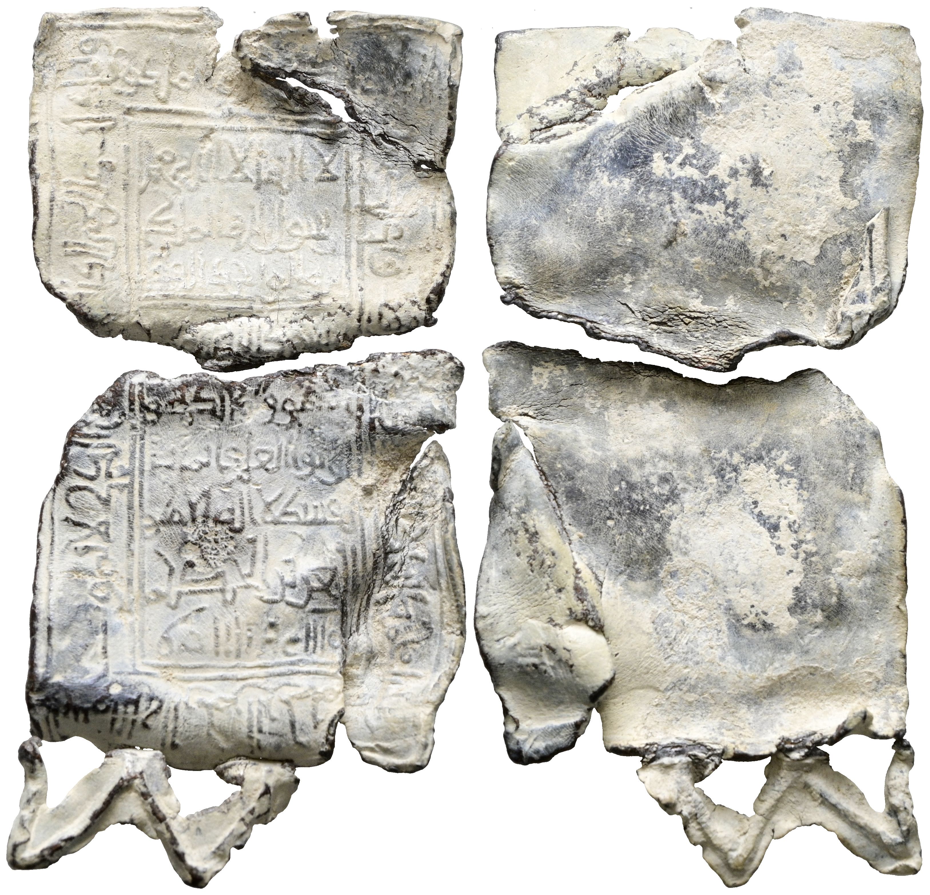 PERIODO ALMORÁVIDE O POSTERIOR. Amuleto rectangular. (Pb. 16,40g/68x33mm). Posiblemente Siglo XII-XV. Placa rectangular de plomo dividida en dos parte con señales de haber estado plegada en forma de díptico. La pieza conserva en la parte inferior, dos de las tres almenas triangulares caladas que debió tener como elemento de suspensión. Anv: Anepígrafo. Rev: Textos coránicos en cúfico elegante y de buen trazo, que se desarrolla en una banda epigráfica que rodea la pieza y enmarca a su vez, un campo central dividido en dos parte. Textos centrales: لا إله إلّا ألله محمد / رسول ألله الملك / و الواحد لله. (No hay otro dios que Dios. Muhammad / es el Enviado de Dios. El poder / y la Unicidad es de Dios.) بسم ألله لا إله / إلّا هو و الملائكة و / أولوا العلم قائما با / لقسط لا إله إلّا هو / العزيز الحكيم. (En el nombre de Dios, no hay otro dios / que Él y los ángeles y / los dotados de / conocimiento proclaman con / verdad: No hay otro dios que Él, / el Poderoso, el Sabio). Margen: بسم ألله الرحمم الرحيم / ـ ـ ـ و اعتصمت /ـ ـ ـ ـ ـ ـ الملكوت / و توكلت على الحيّ الذّي ـ الحيّ الذّي لا يموت (¡En el nombre de Dios, el Clemente, el Misericordioso! /........y me refugio /.......... de la realeza. / Y confío en el Vivo que - el Vivo que no muere). (Amuletos 365-N11. Tipo A-V, mismo ejemplar). MBC.