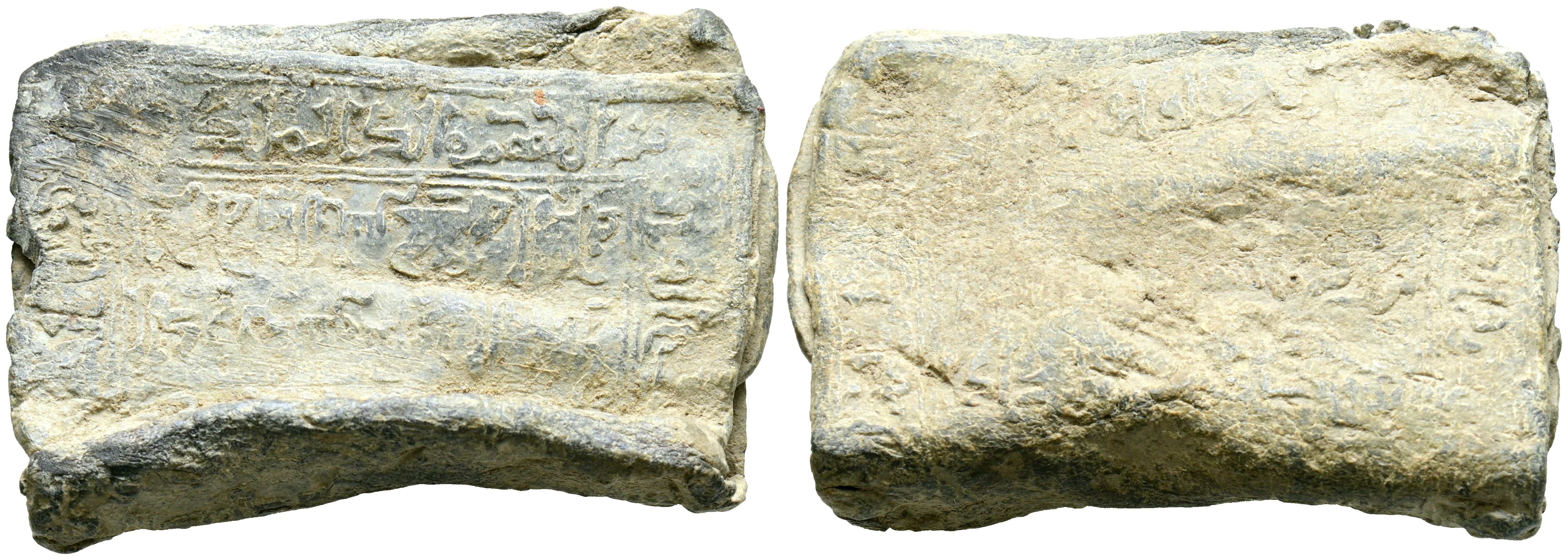 PERIODO CALIFAL O POSTERIOR. Amuleto plegado. (Pb. 26,90g/39x28mm). Posiblemente Siglo X-XI. Placa rectangular de plomo plegada en forma de tríptico cerrado. La pieza presenta escritura en cúfico elegante, con terminaciones en cuello de cisne y las astas de las letras largas acabadas a bisel. Según podemos apreciar en su parte visible, las leyendas se desarrollan en una línea a lo largo de toda la banda que delimita la pieza y en un sector central con múltiples líneas. (Amuletos Tipo A-V). MBC.