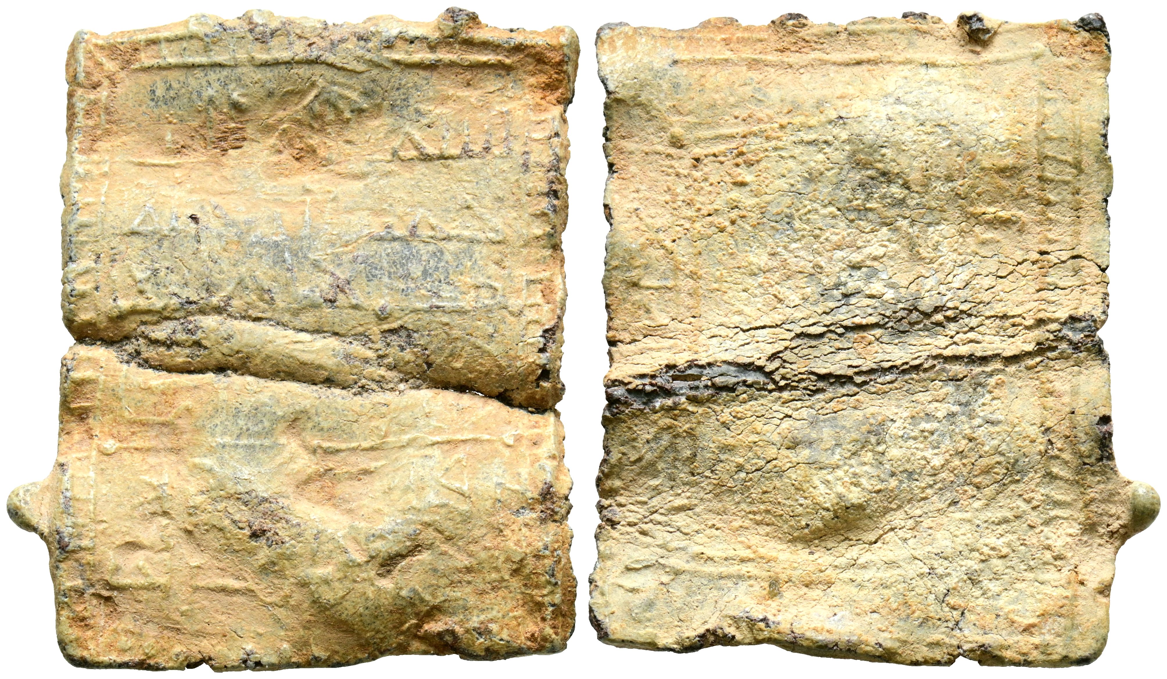 PERIODO CALIFAL O POSTERIOR. Amuleto rectangular. (Pb. 7,83g/32x25mm). Posiblemente Siglo X-XI. Placa rectangular de plomo con señales de haber estado plegada en forma de díptico. Anv: Enmarcado por una cenefa de pequeñas rayitas, texto coránico en cúfico lineal dividido en seis líneas: بسم ألله الر / حمم الرحيم /....ـ. (¡En el nombre de Dios, el Clemente, el Misericordioso! /....). Rev: Aunque muy difusa, se aprecia una banda de enmarque con resto de epigrafía, delimitada en ambos lados por una cenefa similar a la del anverso y un campo central prácticamente borrado. (Amuletos Tipo A-III/VII). MBC+.