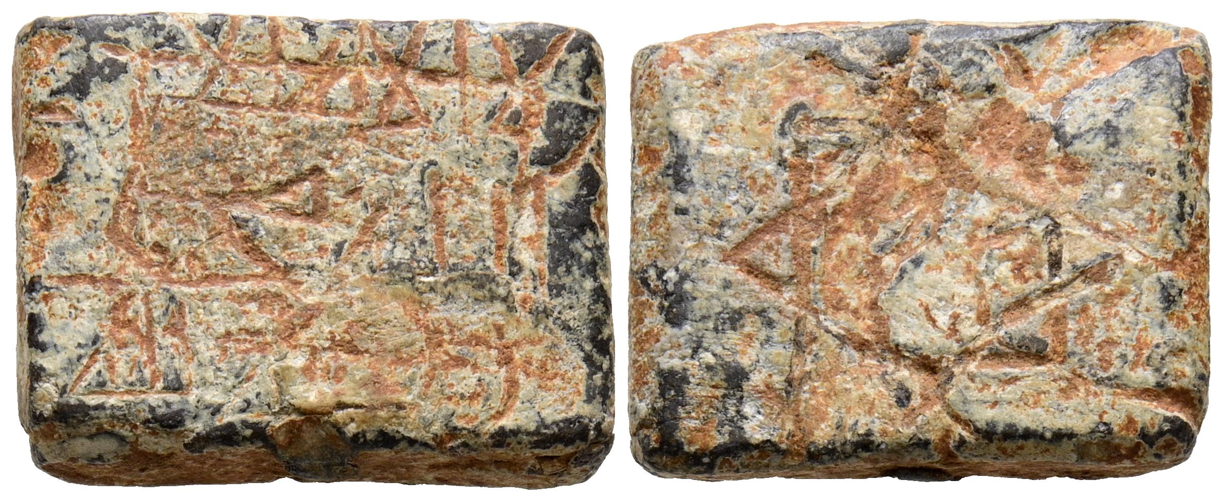 PERIODO CALIFAL. Amuleto rectangular. (Pb. 7,85g/16x12x4mm). Posiblemente Siglo X. Pequeño lingote rectangular de plomo con decoración incisa. Anv: Tres líneas de escritura en cúfico simple: لا إله إلّا / ألله محمّد / رسول ألله. (No hay otro Dios que / Dios. Muhammad / es el Enviado de Dios). Rev: Una estrella de ocho puntas formado por dos cuadrados que se cruzan. (Amuletos 377-N15. Tipo A-X, mismo ejemplar). MBC.