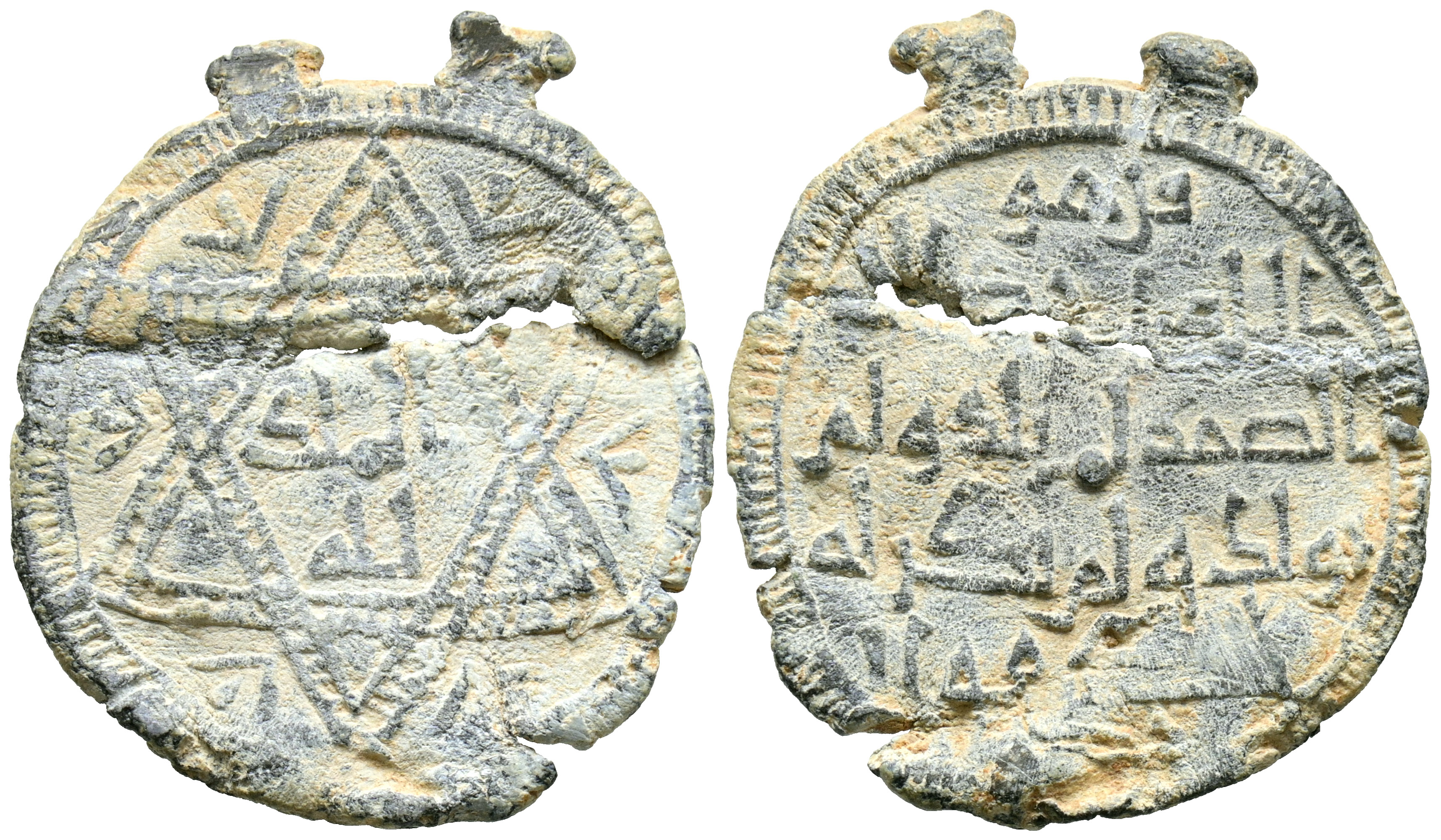 PERIODO CALIFAL. Amuleto-colgante circular. (Pb. 4,14g/28x23mm). Posiblemente Siglo X. Placa de plomo monetiforme con restos de dos aros de sujeción en la parte superior. Recorre todo el borde de ambas áreas, una cenefa de pequeñas líneas radiales. Anv: Estrella de seis puntas o sello de Salomón con leyenda en dos líneas: الملك / لله (La soberanía es de Dios). Los espacios entre la cenefa exterior y la estrella están ocupados cada uno por un motivo en forma de espiga, de tres puntas, mirando hacia afuera. Rev: Dividido en seis líneas, texto coránico en cúfico: قل هو / ألله أحد ألله / الصمد لم يلد و لم / يولد و لم يكن له / كفوا أ / حد. (Di: Él es el Dios Único, el Dios Eterno, no engendró y no fue engendrado, y no tiene semejante ninguno). La pieza presenta una línea de rotura por doblez en la parte superior. (Amuletos 121-G11. Tipo B-I, mismo ejemplar). MBC.