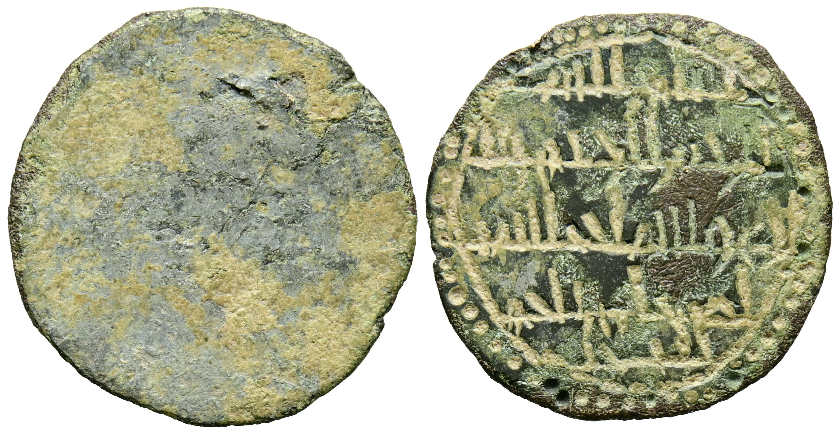 PERIODO CALIFAL. Amuleto monetiforme con escritura incisa. (Ae. 1,22g/19mm). Posiblemente Siglo X. Anv: Anepígrafo. Rev: Rodeado por una fina gráfila de puntos y dividido en cinco líneas, texto coránico en cúfico muy esquemático: بسم الله / الرحمن الرحيم لله / العزّة الله أحد الله / الصمد لم يلد و / لم يولد. (¡En el nombre de Dios, el Clemente, el Misericordioso!. De Dios es la Gloria. Dios es Uno, Dios es Eterno, no engendró y no fue engendrado). (Amuletos 133-G35. Tipo B-I, mismo ejemplar). MBC.