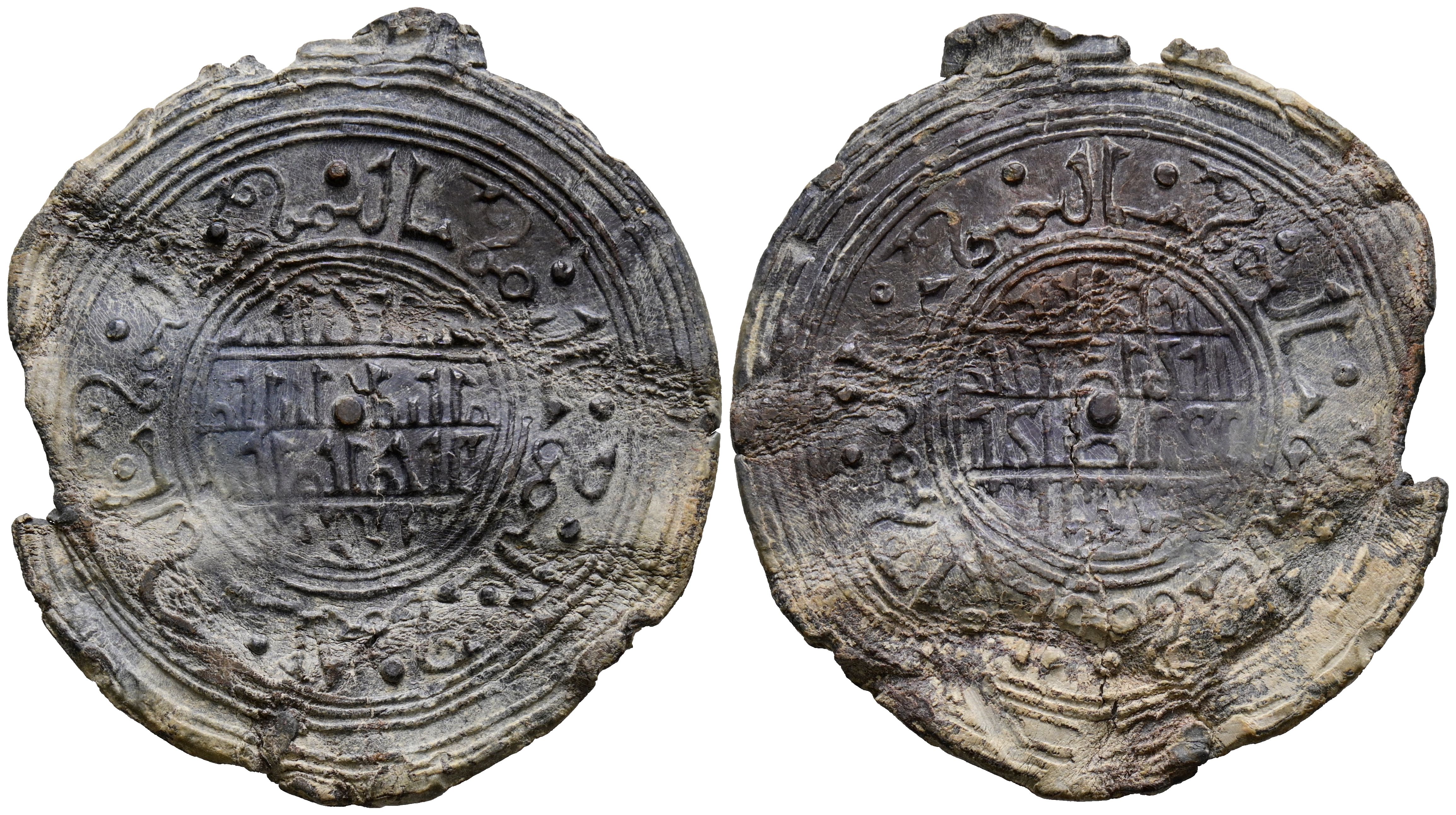 PERIODO CALIFAL O POSTERIOR. Amuleto monetiforme. (Pb. 9,90g/36x33mm). Posiblemente Siglo X-XV. Pieza circular de gran tamaño y elaborada caligrafía que sin duda tuvo un elemento de suspensión en su parte superior del que quedan restos. Ambas áreas tienen la misma disposición, limitadas al exterior por dos filetes lineales triples que dejan entre ellos una estrecha banda lisa. Otro filete circular triple divide el interior en dos amplias zonas que soportan el campo epigráfico: La exterior es una banda en la que aparece una sucesión de la palabra اليمن. (la suerte) que se repite seis veces en anverso y cinco en el reverso, en una magnífica caligrafía cúfica con las "num" acabadas en cuello de cisne y las astas de las letras largas acabadas a bisel. El campo central contiene cuatro líneas de pseudo-escritura cúfica y un punto central más grueso. La línea superior está separada del resto por un delgado filete lineal, y la línea inferior está invertida. (Amuletos Tipo B-III; Pieza publicada en Manquso nº8, pág. 79-80, mismo ejemplar). MBC+.