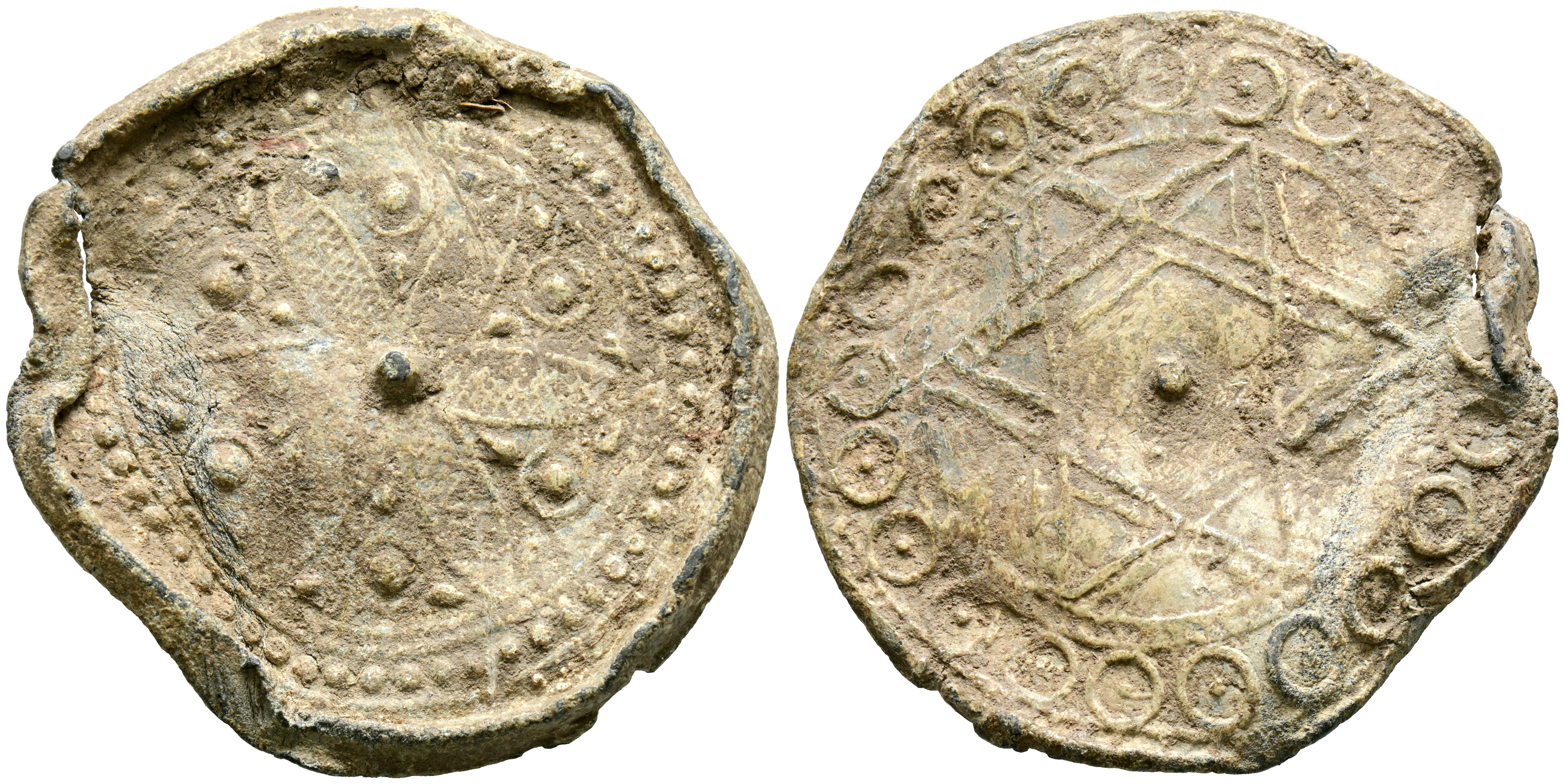PERIODO CALIFAL/TAIFAS. Amuleto monetiforme de gran módulo. (Pb. 18,00g/39x42mm). Posiblemente Siglo X-XI. Anv: Bordea toda la pieza una amplia banda en la que se repite un motivo de círculos con un punto central y en centro, una estrella de seis puntas o sello de Salomón. Rev: Una flor de seis pétalos ricamente ornamentada con círculos y puntos. (Similar en anverso a Amuletos 153 y en reverso, al anverso Amuletos 125. Tipo B-IV/V). MBC.