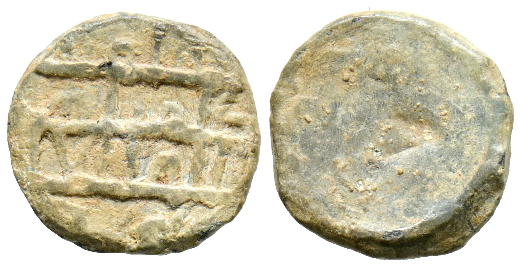 CRONOLOGÍA INCIERTA. Amuleto monetiforme diminuto. (Pb. 1,11g/11mm). Siglo incierto. Anv: Tres líneas de escritura cúfica lineal. No tiene rastros de anillos de sujeción. Tal vez sea la tapa de un amuleto tubular. (Amuletos 411. Tipo B-VI, mismo ejemplar). MBC.