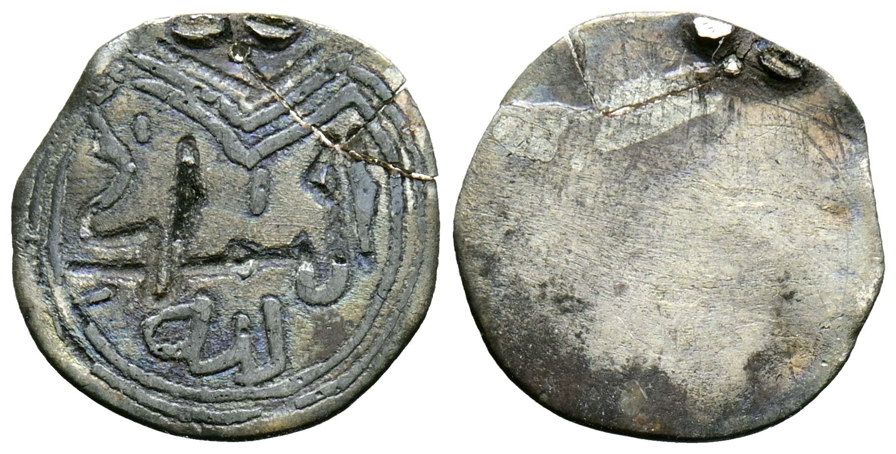 PERIODO DE TAIFAS /ALMORÁVIDE. Amuleto monetiforme diminuto. (Pb. 0,40/13mm). Posiblemente Siglo XI-XII. Anv: Dos líneas de escritura en cúfico: الملك / لله. (La soberanía es de Dios). Rev: Anepígrafo. La pieza presenta en la parte superior resto de soldadura, así como una doble fractura reparada. (Amuletos Tipo B-VI). MBC-.