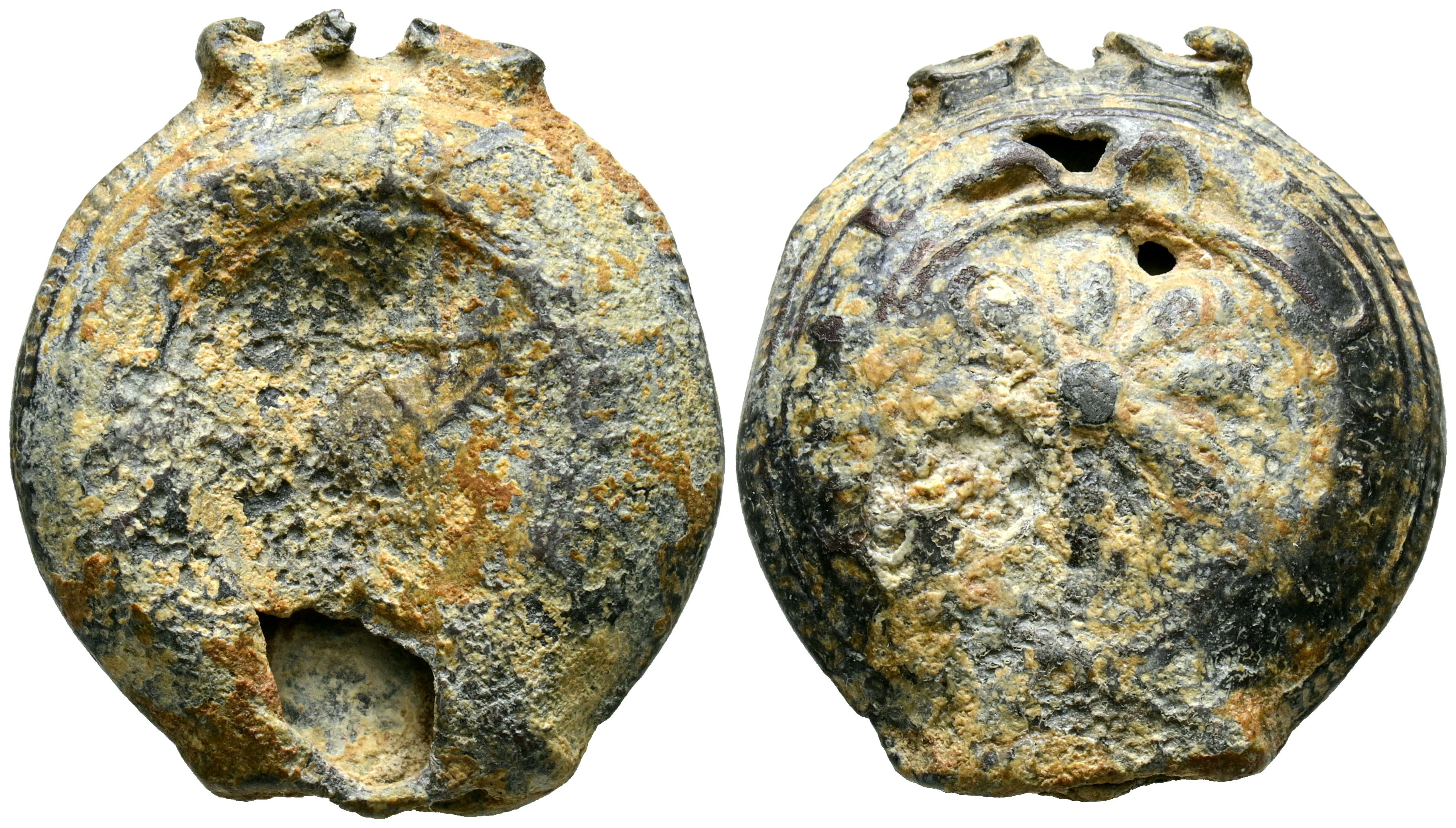 PERIODO DE TAIFAS. Amuleto-estuche. (Ae. 11,60g/27x25mm). Posiblemente Siglo XI. Estuche de forma lenticular y restos de dos anillas de suspensión en el borde superior. Anv: Una banda epigráfica ilegible rodeando a un círculo central, en el que hay inscrita una estrella de ocho puntas de trazo contínuo. Rev: Una banda epigráfica en cúfico simple con la Misión profética de Muhammad: محمد رسول ألله (Muhammad es el Enviado de Dios) rodeando al círculo central, y en éste una estrella radiante de ocho brazos ovalados de punta roma, cada uno rodeado por un estrecho filete lineal. En el centro tiene un gran punto. La pieza presenta un agujero en la parte inferior del anverso y dos mucho más pequeños en la parte superior del reverso. (Amuletos 161-G39. Tipo, A-Cajas-I, mismo ejemplar). MBC.