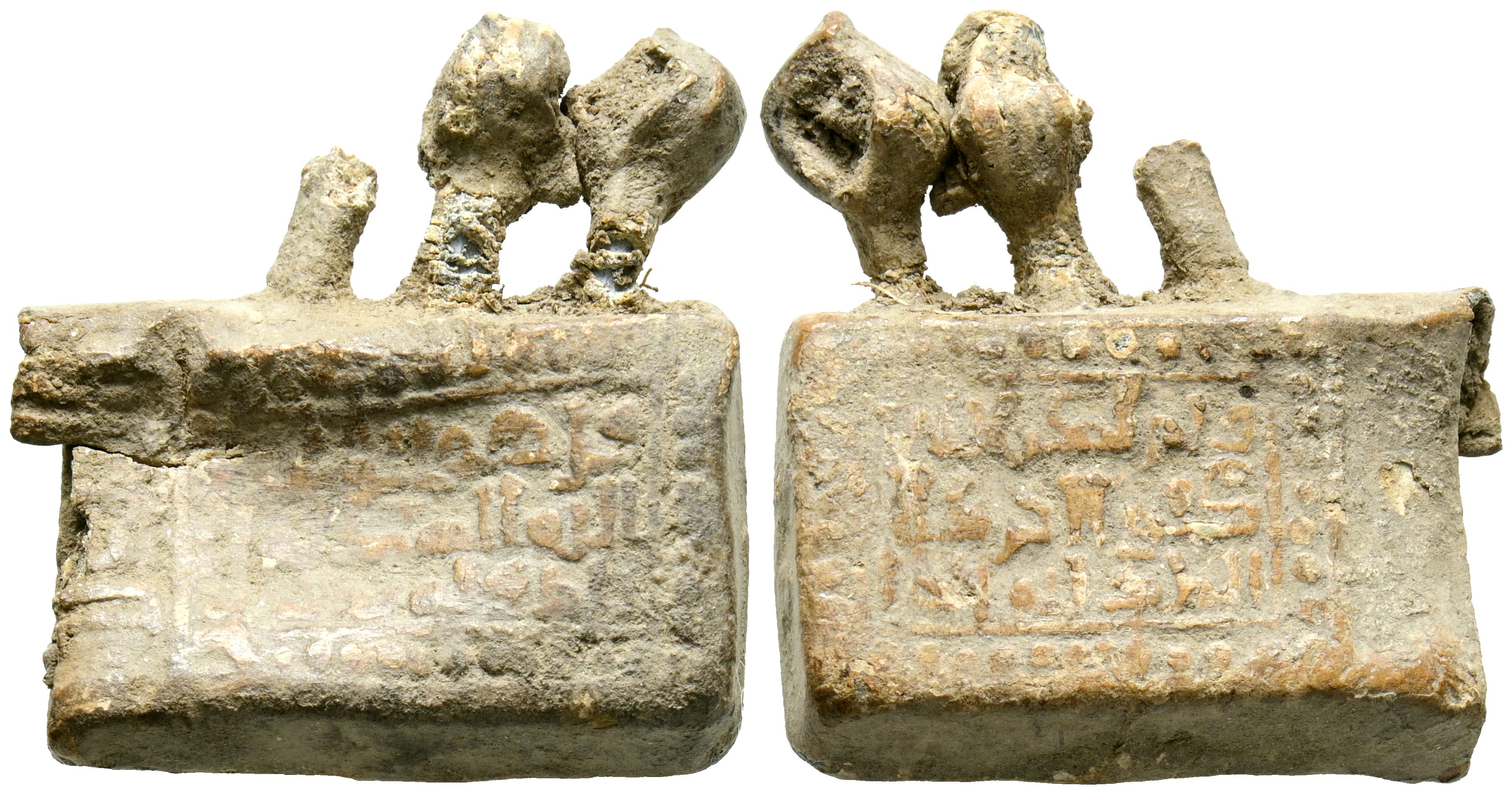 PERIODO CALIFAL O TAIFAS. Amuleto-estuche. (Pb. 15,00g/26x24x7mm). Posiblemente Siglo X-XI. Estuche rectangular de plomo con abertura en el lado menor izquierdo y parte de tres elementos de suspensión o sujeción en la parte superior. En ambas áreas, enmarcadas por una cenefa de puntos, tres líneas de escritura cúfica elegante y de buena traza, con las astas de las letras altas acabadas a bisel y alguna terminación en "cuello de cisne". Anv: قل هو ألله أحد / ألله الصمد لم / يلد و لم يولد. (Di: Él es el Dios Único, / el Dios Eterno, no / engendró y no fue engendrado). Rev: و لم يكن له / كفوا أحد / الملك لله (y no tiene / semejante ninguno. / La majestad es de Dios). (Similar a Amuletos 196 y 197. Tipo A-Cajas-III). MBC.