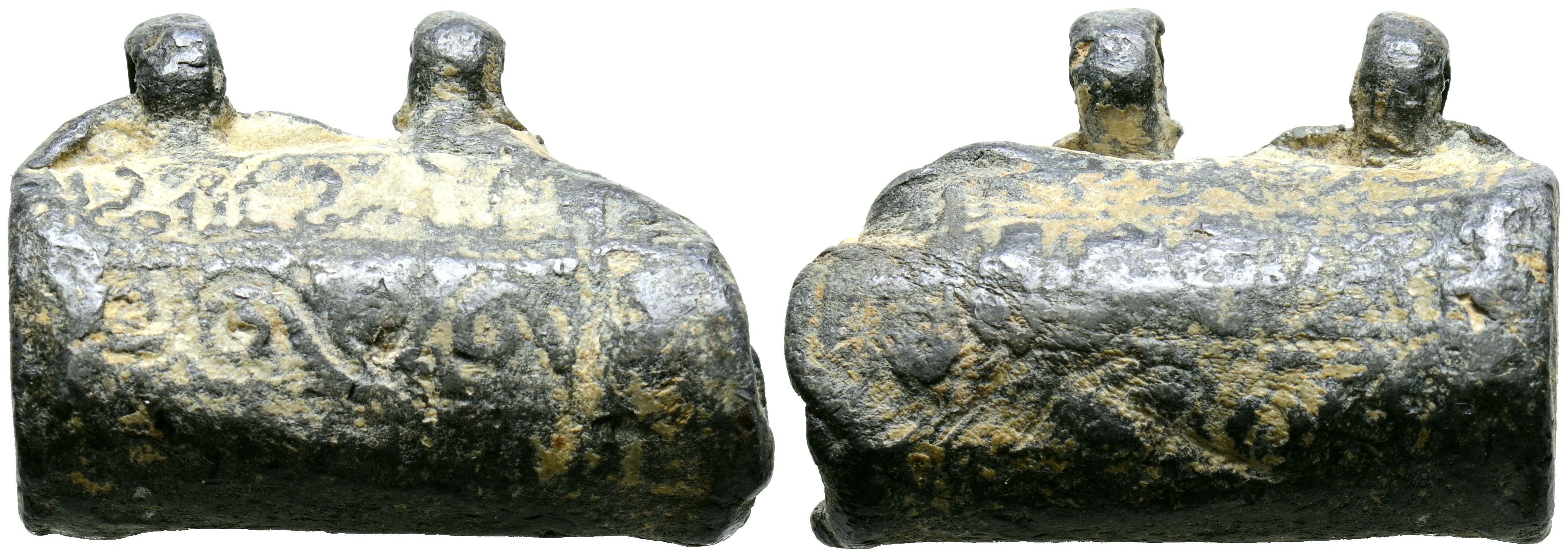 PERIODO CALIFAL O POSTERIOR. Amuleto-estuche. (Pb. 16,20g/30x22mm). Posiblemente Siglo X-XII. Estuche de plomo en forma cilíndrica de tapa oval y dos anillas de sujeción afrontadas en la parte superior. La decoración se basa en una sucesión de bandas paralelas a lo largo de la pieza. La primera contiene una banda epigráfica en cúfico bien ejecutado y algunas terminaciones de las letras altas acabadas a bisel y "cuello de cisne", mientras que en la segunda, se repite un motivo de ondas. Este patrón parece repetirse tres veces, con un total de seis bandas, separadas entre sí por una finísima cenefa de rayitas diagonales. (Similar a Amuletos 231. Tipo B-Tubos-de dos asas). MBC+.