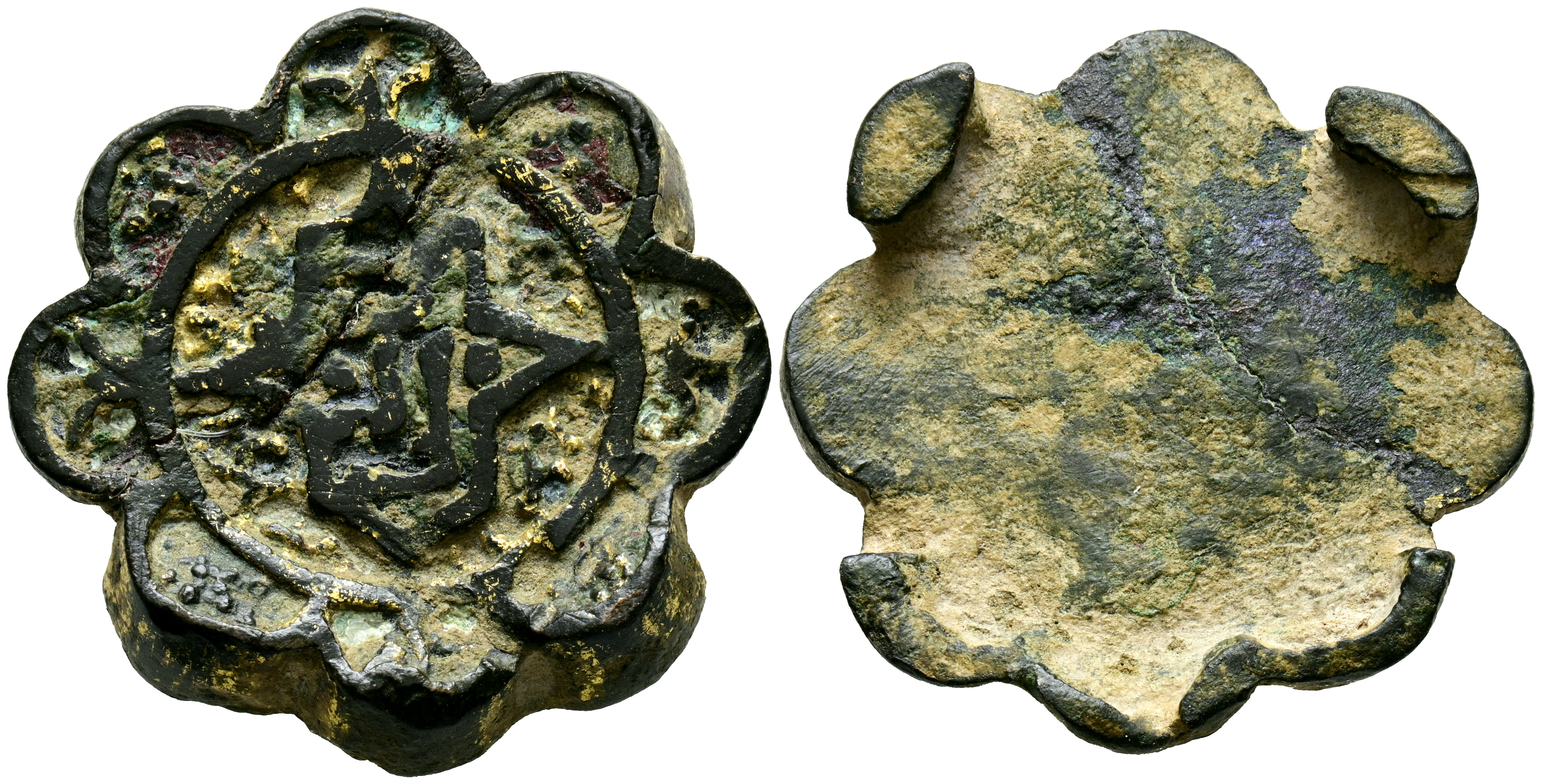 PERIODO ALMOHADE. Amuleto. (Ae. 19,16g/34x34x5mm). Posiblemente Siglo XIII-XIV. Aplique de bronce con incrustaciones de pasta vítrea y múltiples restos de dorado. Anv: Presenta un campo circular rodeado de ocho semi círculos, cada uno de ellos, con una flor de tres pétalos en su interior y restos de diferentes tonalidades; rojo, verde y azul. El campo central contiene una pseudo-estrella de ocho puntas con escritura en su interior, donde parece poner: "li-llah" (¡Por Dios!). Rev: Anepígrafo. La pieza presenta una grieta diagonal visible en ambas áreas, dando la sensación de estar pegada. (Amuletos 388-N28. Tipo Propiciatorios; Pieza publicada en Manquso Nº14, pág. 146 por Sebastián Gaspariño, mismo ejemplar). MBC.