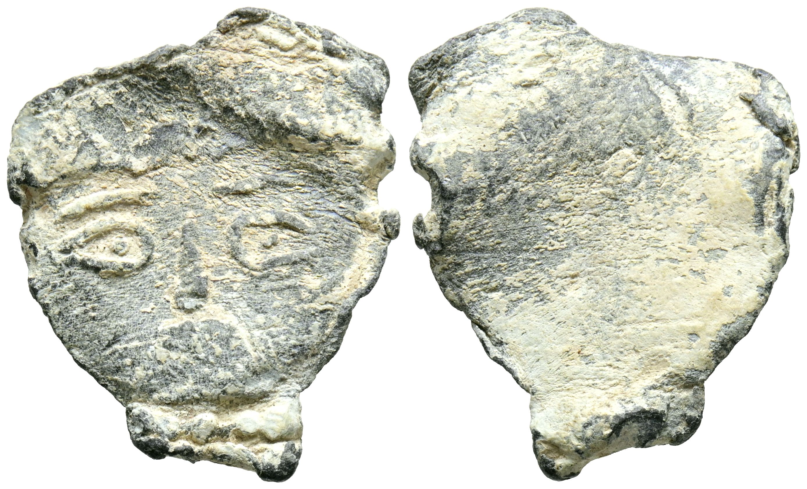 PERIODO CALIFAL O POSTERIOR. Amuleto tipo "Tanit". (Pb. 5,30g/22x19mm). Posiblemente Siglo X-XV. Figura humana. Cara en posición central, con grandes ojos almendrados, restos de una diadema y un collar de cuentas circulares. Reverso liso. (Amuletos 387-N26, mismo ejemplar). MBC. Muy raro ejemplar.