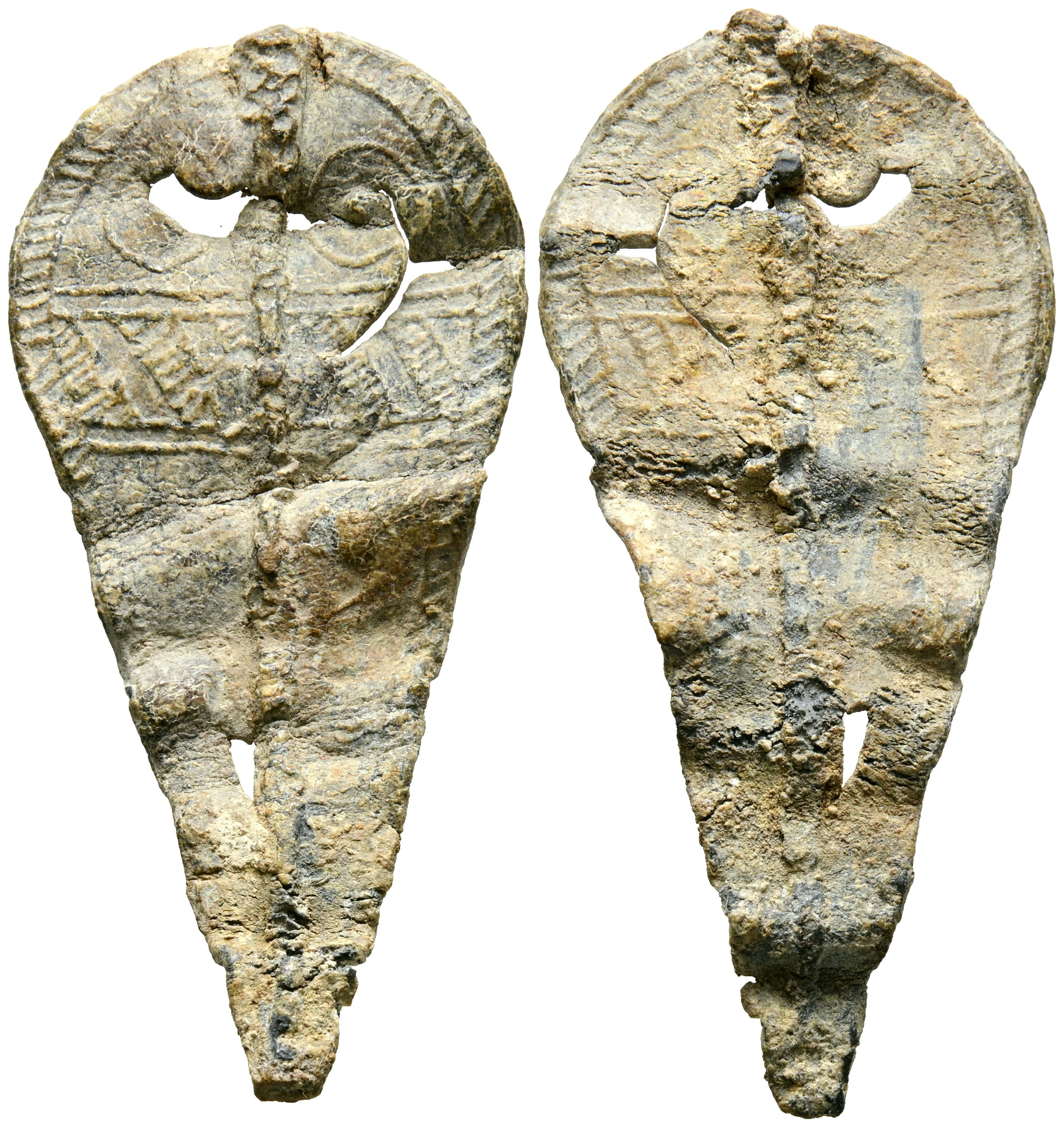 CALIFAL O POSTERIOR. Amuleto tipo "vida cotidiana". (Pb. 5,29g/44x20mm). Posiblemente Siglo X-XV. Placa de plomo en forma de punta de lanza, hoja plana en forma de hoja de laurel con nervio central ornamentada y sin vástago central. (Amuletos 493-N2203, mismo ejemplar). MBC.