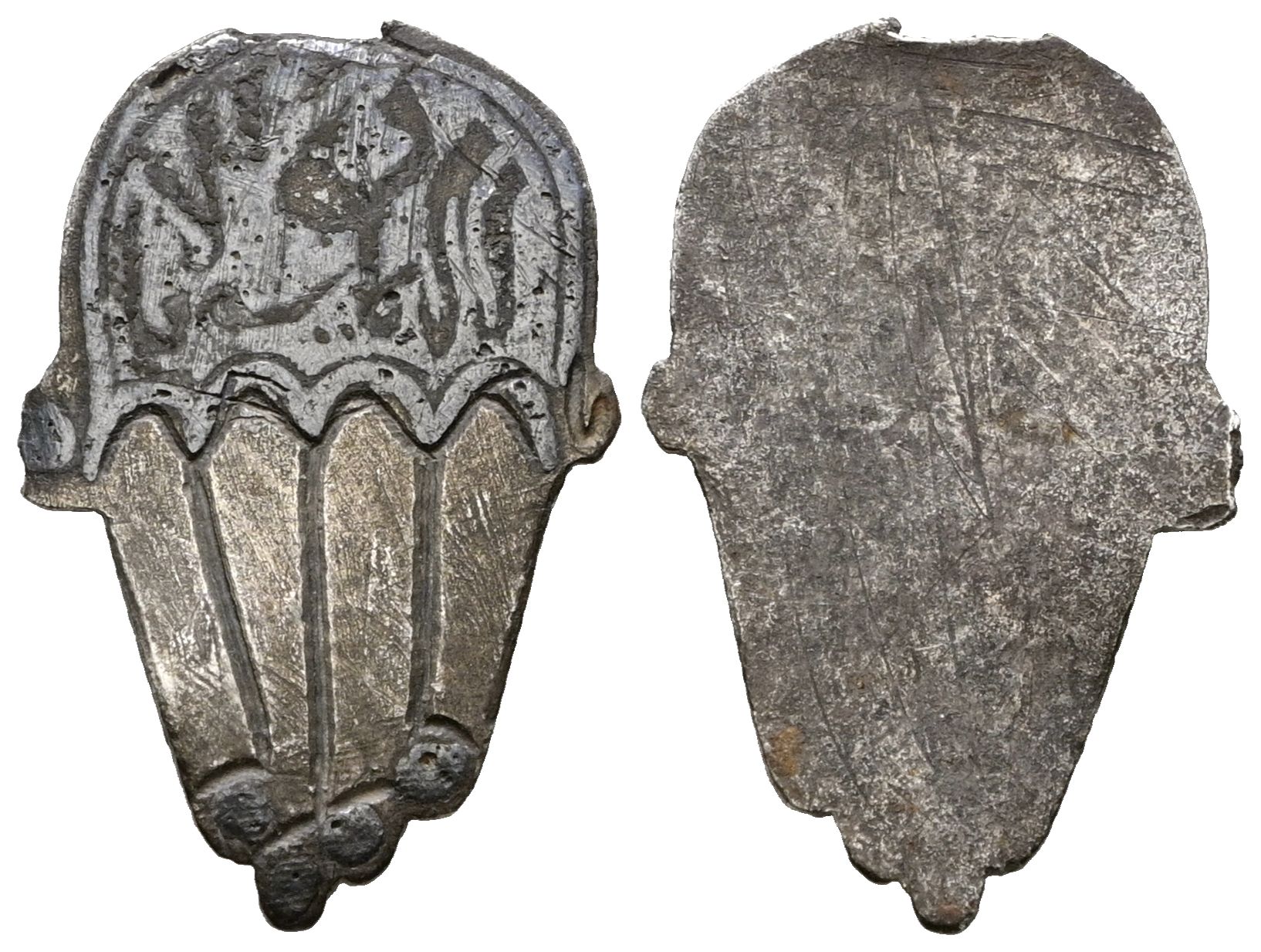 PERIDODO NAZARÍ. Mano de Fátima. (Ar. 1,25g/15x22mm). Posiblemente Siglo XIV-XV. Pequeña lámina de plata en forma de mano. Anv: Leyenda en escritura nasji muy elegante, pero de difícil lectura. Según estudio, una interpretación sería: اليمن و الّاى (La suerte y las desgracias). Rev: Anepígrafo. La pieza presenta en la parte de la escritura, así como en las uñas, una especie de pasta vítrea de color azul. (Amuletos 456-Mq. 5-11.3; Pieza publicada en Manquso nº6, pág. 106, mismo ejemplar). MBC.