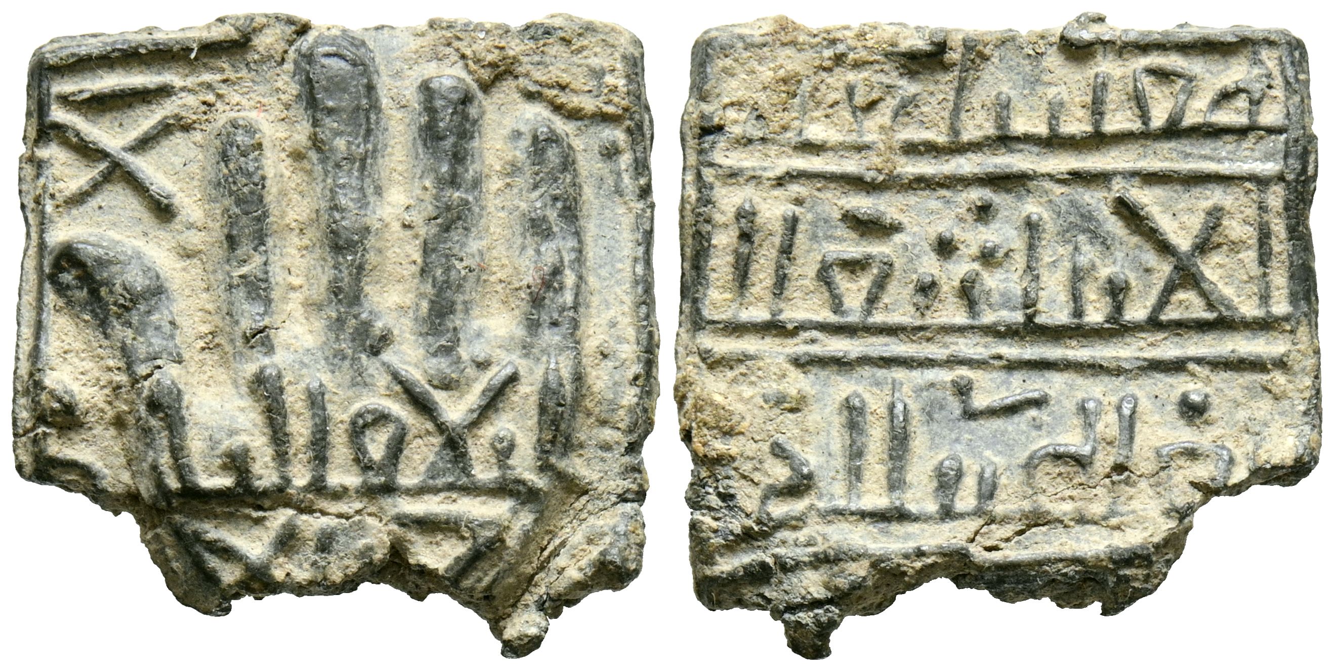 SELYÚCIDA. Amuleto de Anatolia. (Pb. 3,30g/19x18mm). Posiblemente Siglo XII-XIII. Placa cuadrada de plomo con falta en la parte inferior. Anv: "Mano de Fátima" con dos líneas de escritura en cúfico lineal de trazo simple. Rev: Leyenda en tres líneas de escritura cúfica. (Amuletos 401-N36, mismo ejemplar). MBC. Muy interesante.