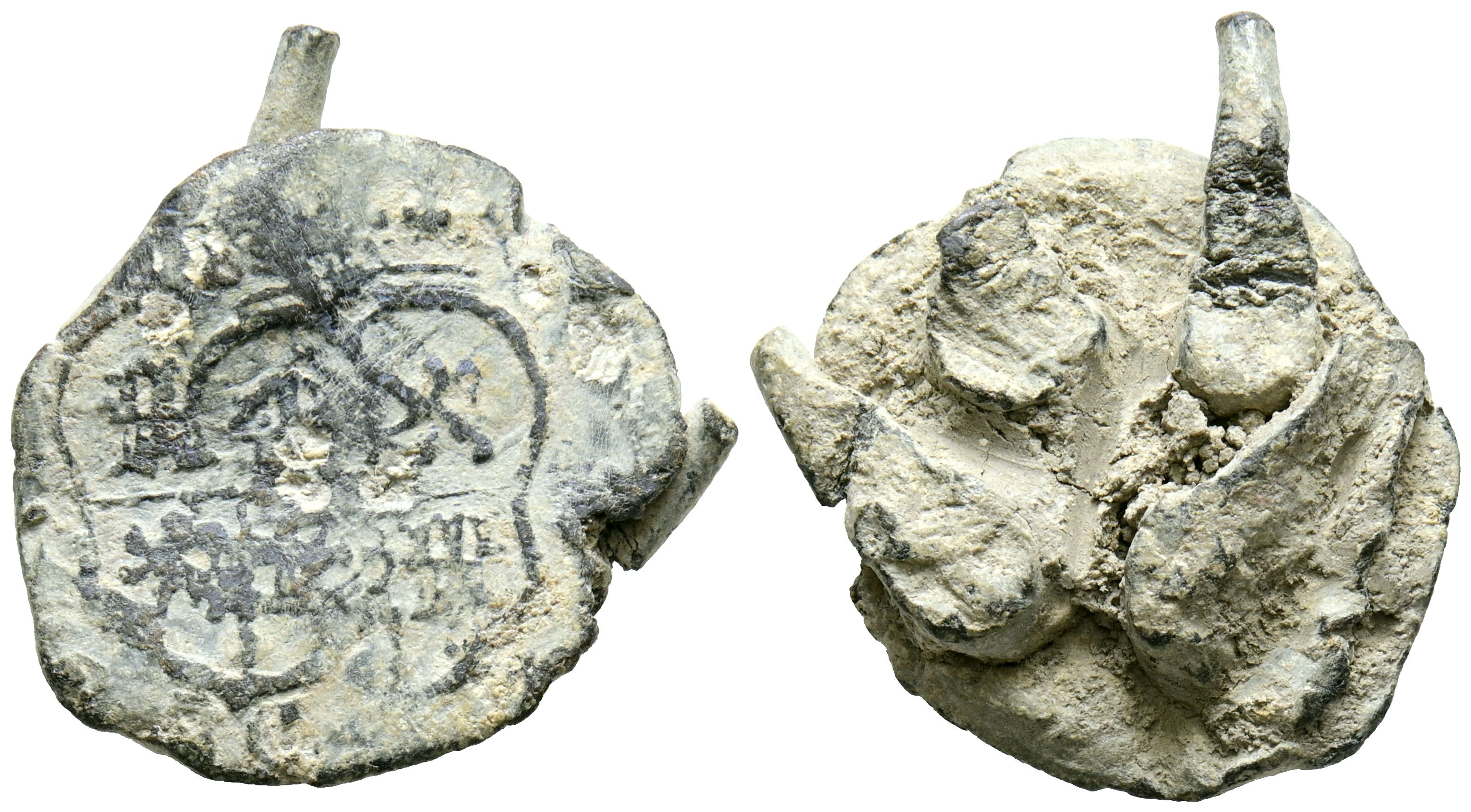Precinto o plomo de saca. (Pb. 6,73g/20x19x4mm). Anv: Escudo cuartelado con castillos y leones. Rev: Anepígrafo. MBC+. Escaso.