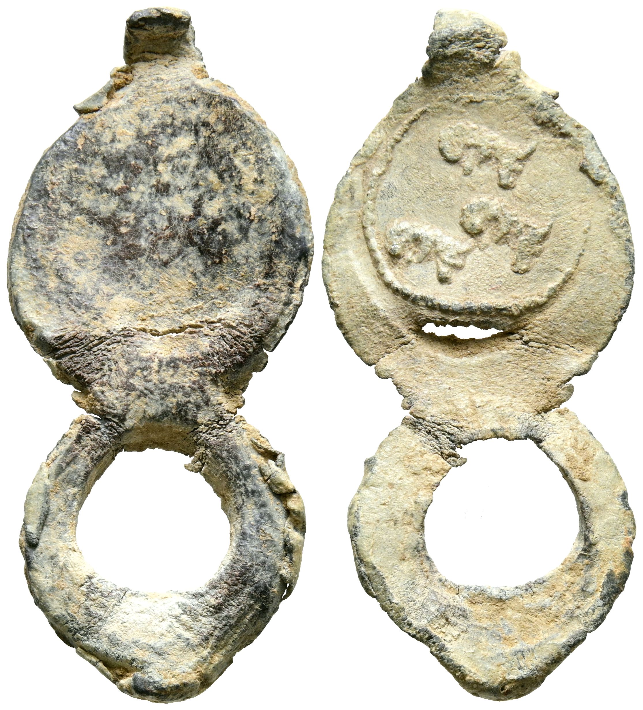 Precinto o plomo de saca. (Pb. 3,23g/34x16x2mm). Anv: Escudo cuartelado con castillos y leones. Rev: Anepígrafo. MBC+. Escaso.