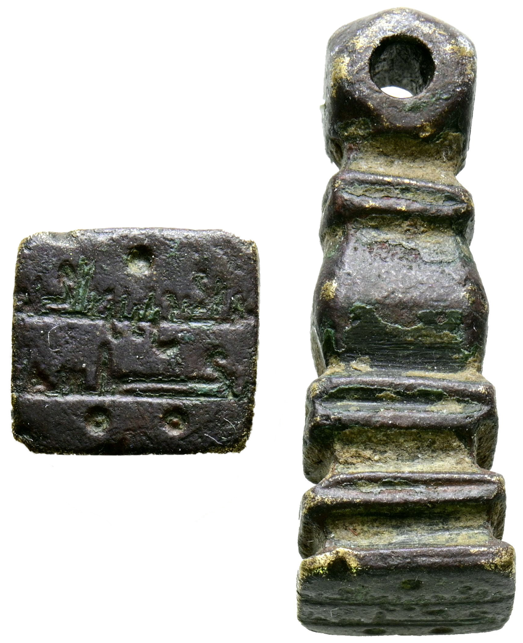 PERIODO CALIFAL O TAIFAS. Matriz para sello de cera o lacre. (Ae. 11,44g/28x10x9mm). Posiblemente Siglo X-XI. Rectangular, cuerpo tronco piramidal con perforación en la parte superior para colgar. Leyenda en dos líneas realizadas en cúfico sencillo de trazo profundo: عبد العز يز بن عبدة/ مسا كر ('Abd al-'Azīz b. 'Ubada / agradecido). (Pieza publicada en Manquso nº8, pág. 66 por Sebastián Gaspariño y Tawfiq Ibrahim, mismo ejemplar). MBC.