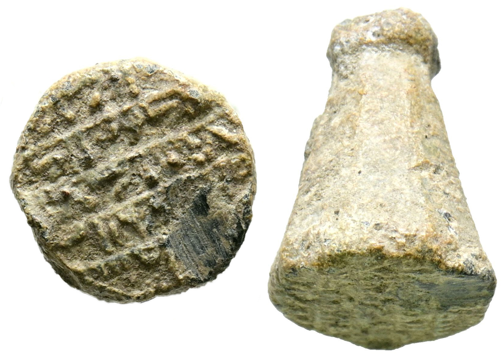 PERIODO EMIRAL O CALIFAL. Matriz para sello de cera o lacre. (Pb. 6,68g/15x10x10mm). Posiblemente Siglo IX-X. Circular y cuerpo troncocónico. Leyenda en cuatro líneas realizadas en cúfico lineal. Dado que la pieza no tiene elentos de suspensión, así como, el hecho de que su escritura no se presenta en negativo, podría indicarnos que nos encontramos ante algún tipo de amuleto, en lugar de un sello. (Pieza publicada en Manquso nº8, pág. 67 por Sebastián Gaspariño y Tawfiq Ibrahim, mismo ejemplar). MBC.