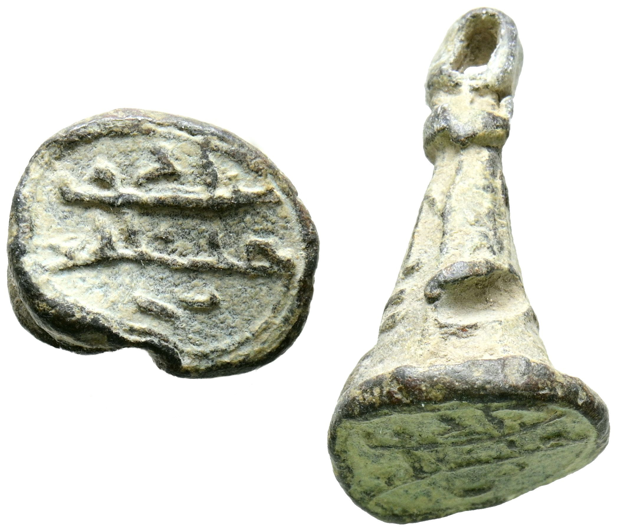 PERIODO CALIFAL O POSTERIOR. Matriz para sello de cera o lacre. (Pb. 7,95g/25x13x11mm). Posiblemente Siglo X-XIII. Circular, cuerpo troncocónico y anilla en la parte superior para colgar. Leyenda en dos líneas realizadas en cúfico sencillo de buena factura. La pieza presenta además de un importante corte en el tronco, los que parecen, dos líneas más de escritura que discurren a ambos lados de manera longitudinal desde la base a la anilla. (Pieza publicada en Manquso nº8, pág. 68 por Sebastián Gaspariño y Tawfiq Ibrahim, mismo ejemplar). MBC.