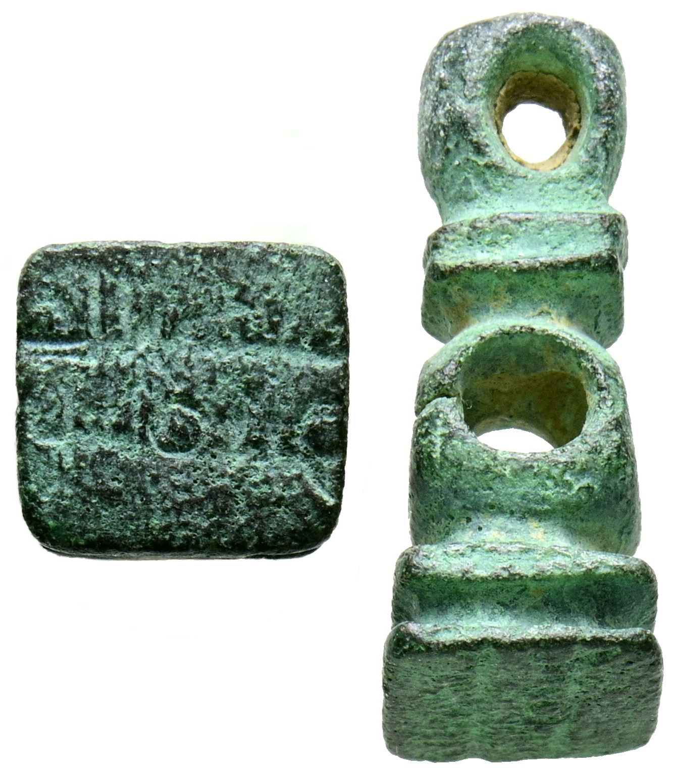 PERIODO CALIFAL O TAIFAS. Matriz para sello de cera o lacre. (Ae. 4,01g/21x8x7mm). Posiblemente Siglo X-XI. Cuadrangular, cuerpo tronco piramidal con oquedad de cuatro salidas en el centro y perforación en la parte superior para colgar. Leyenda en dos líneas realizadas en cúfico, del que solo podemos trascribir la primera: علي بن مغيث؟/ـ ـ ـ ('Alī b. Mugīt?/ ….). (Pieza publicada en Manquso nº8, pág. 73 por Sebastián Gaspariño y Tawfiq Ibrahim, mismo ejemplar). MBC.