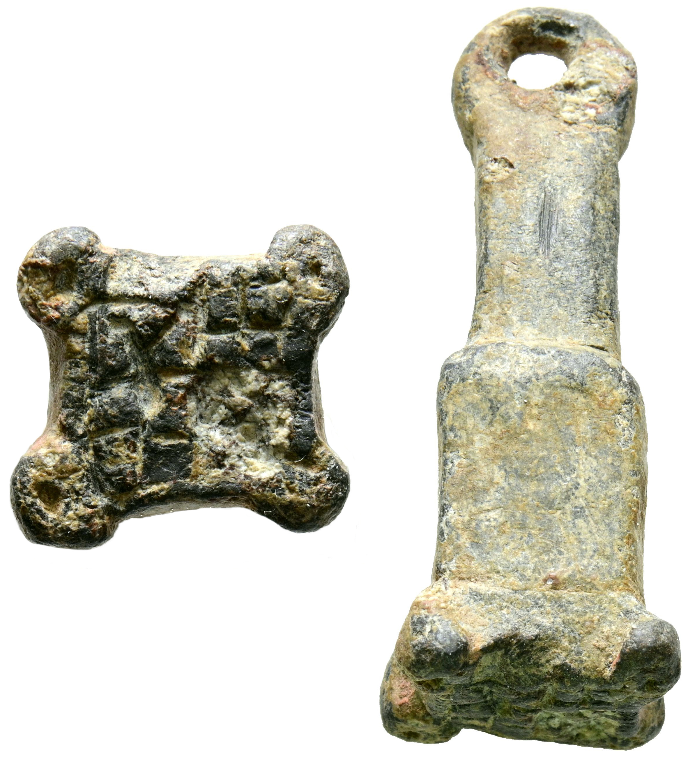 PERIODO CALIFAL. Matriz para sello de cera o lacre. (Pb. 23,96g/36x14x14mm). Posiblemente Siglo X. Rectangular con los vértices rematados con círculos, cuerpo tronco piramidal en dos partes de distinto grosor y con perforación en la parte superior para colgar. La alteración a consciencia de la base mediante incisiones lineales no permite apreciar el tipo de escritura. MBC-.