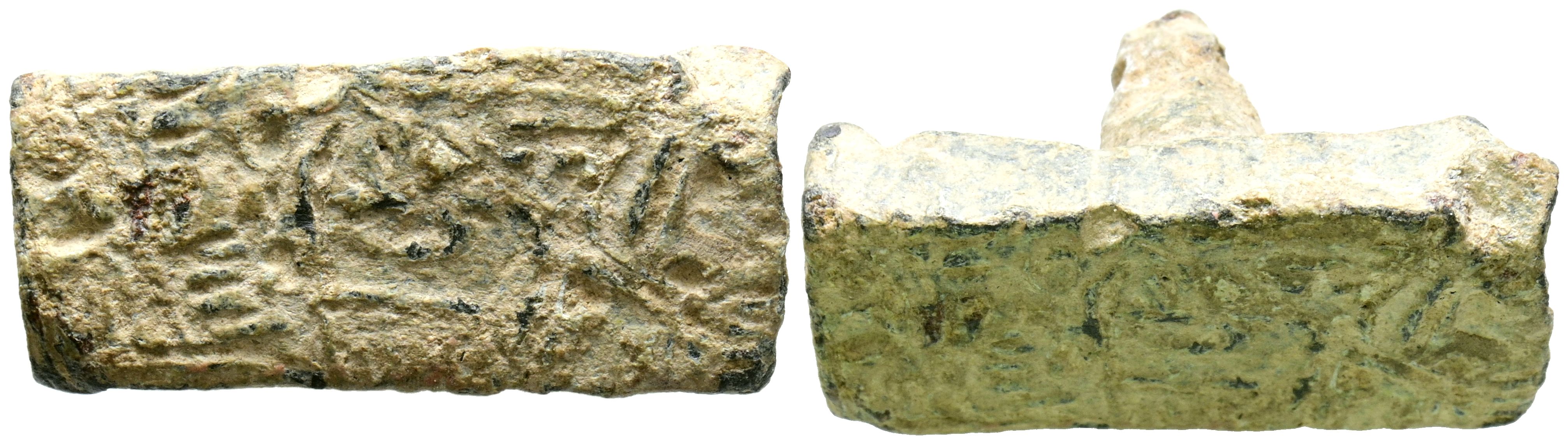 PERIODO CALIFAL. Matriz para sello de cera o lacre. (Pb. 17,25g/26x14x11mm). Posiblemente Siglo X. Rectangular. El cuerpo se basa en una simple y gruesa placa de plomo con una pequeña espiga troncocónica como elemento de sujeción. MBC.