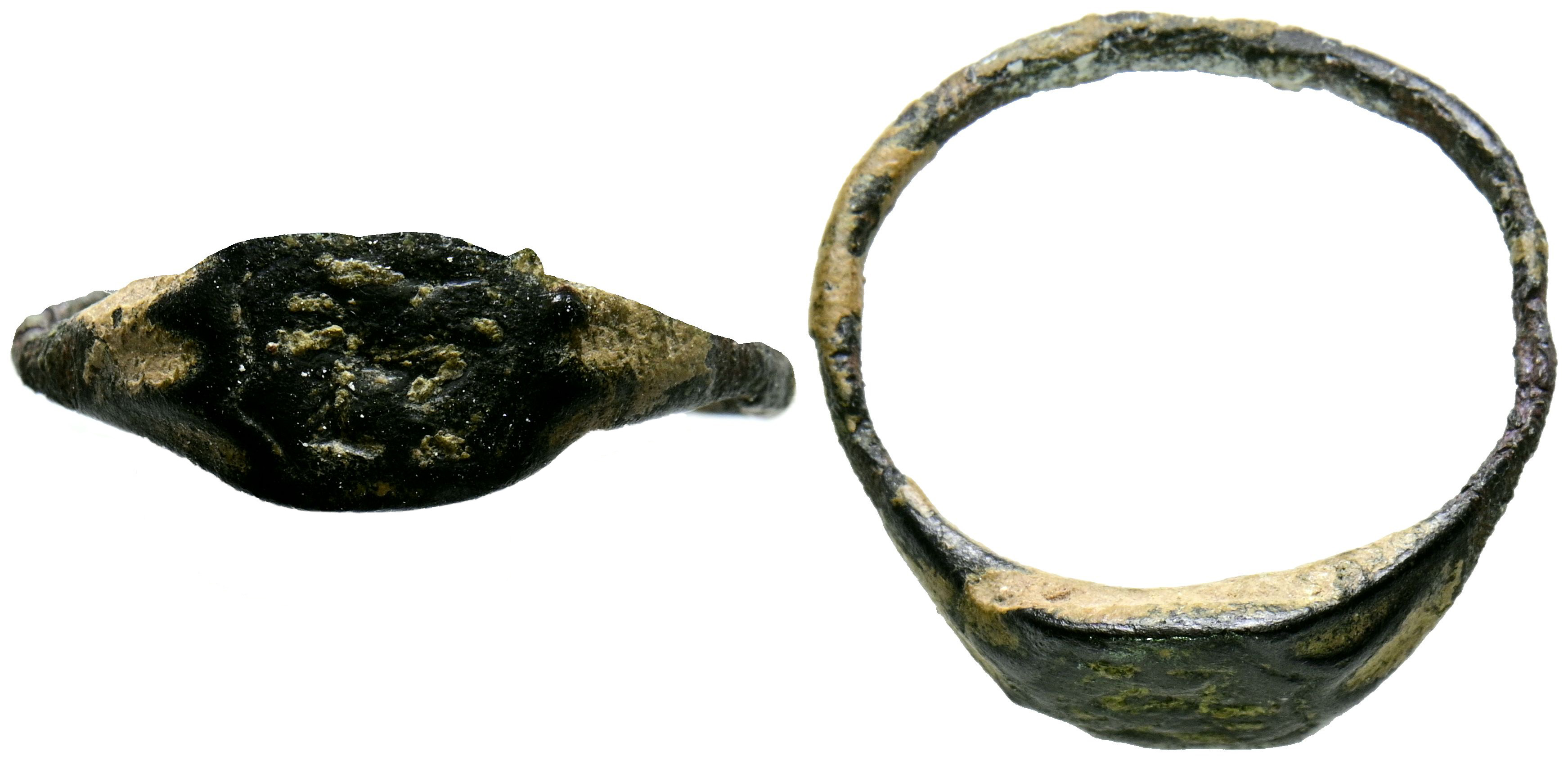 Sello-Anillo. (Ae/Cu. 3,20g). Aparentemente solo contiene una letra o signo, pero muy deteriorado. MBC.