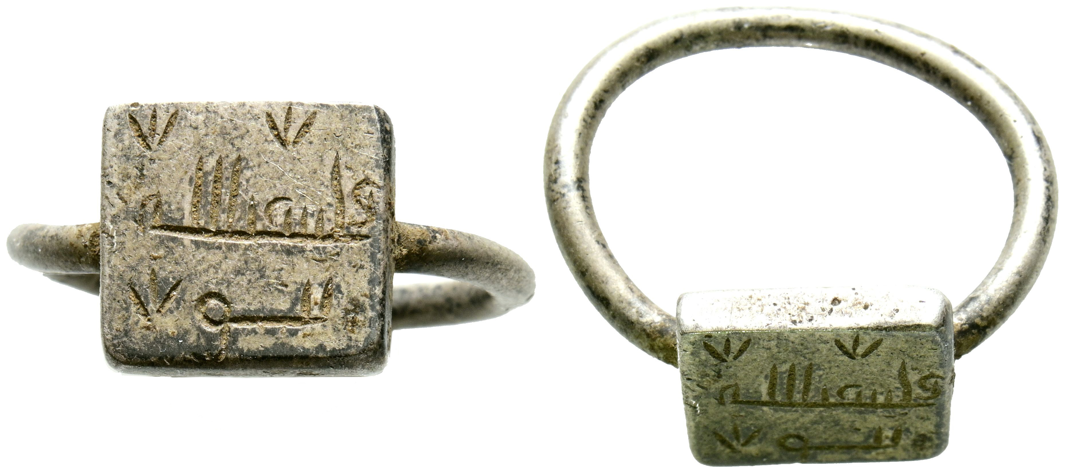 POSIBLEMENTE CALIFAL O EMIRAL. Sello-Anillo. (Ar. 6,62g/13x12mm). Leyenda en dos líneas de escritura en cúfico lineal sencillo con tres pequeños adornos en forma de espiga. MBC+. Muy interesante.